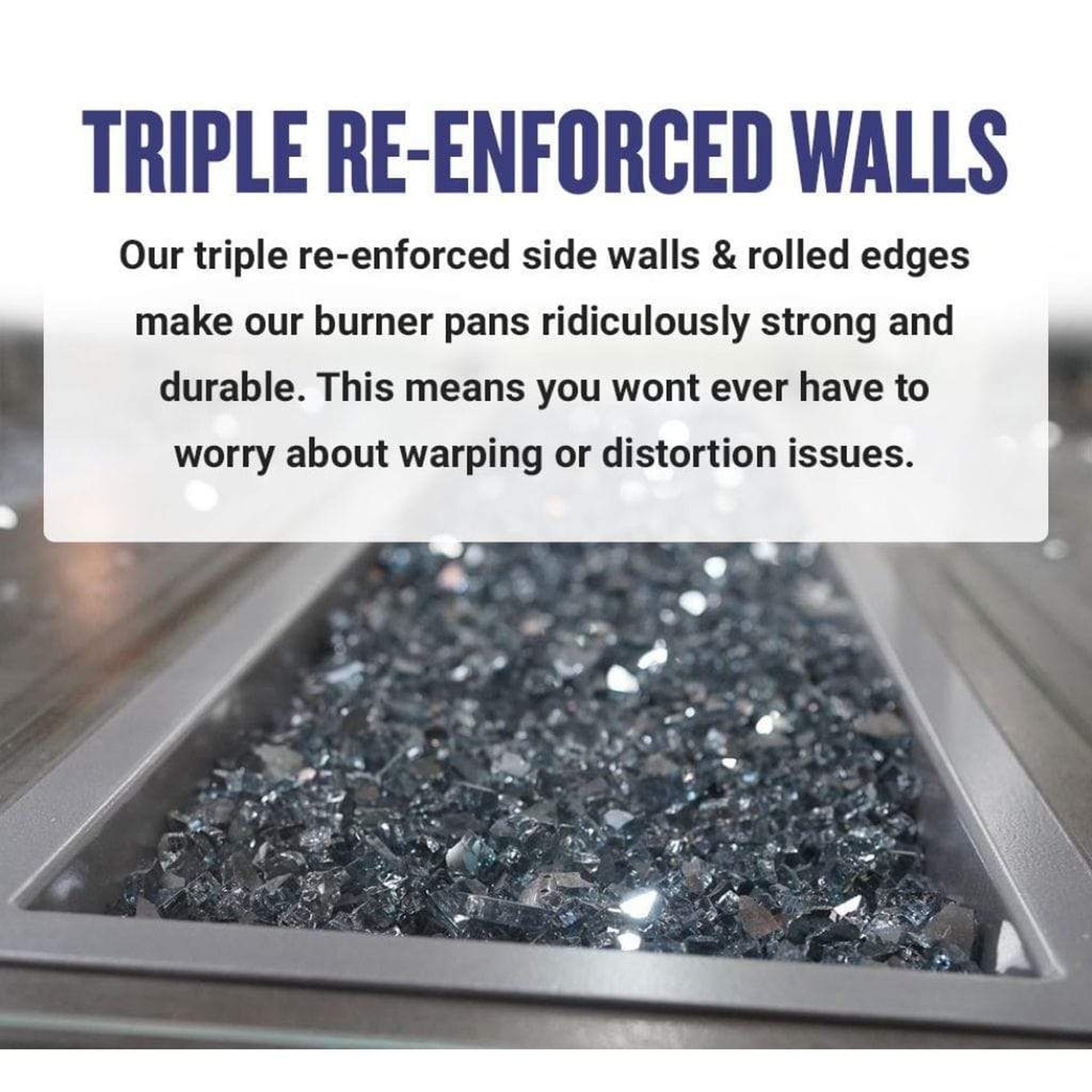 Our 18" square drop-in burner pans come with a convenient lip so that they can easily be inserted into your customers' square fire pit and then removed after use. Fire pit pans give fire pits a false bottom which significantly reduces the amount of fire glass your customers will need for their display because the pans create the illusion that the entire fire pit is full of fire glass, whereas only the top portion of it is. Your customers get an amazing fire display with minimal fire glass!