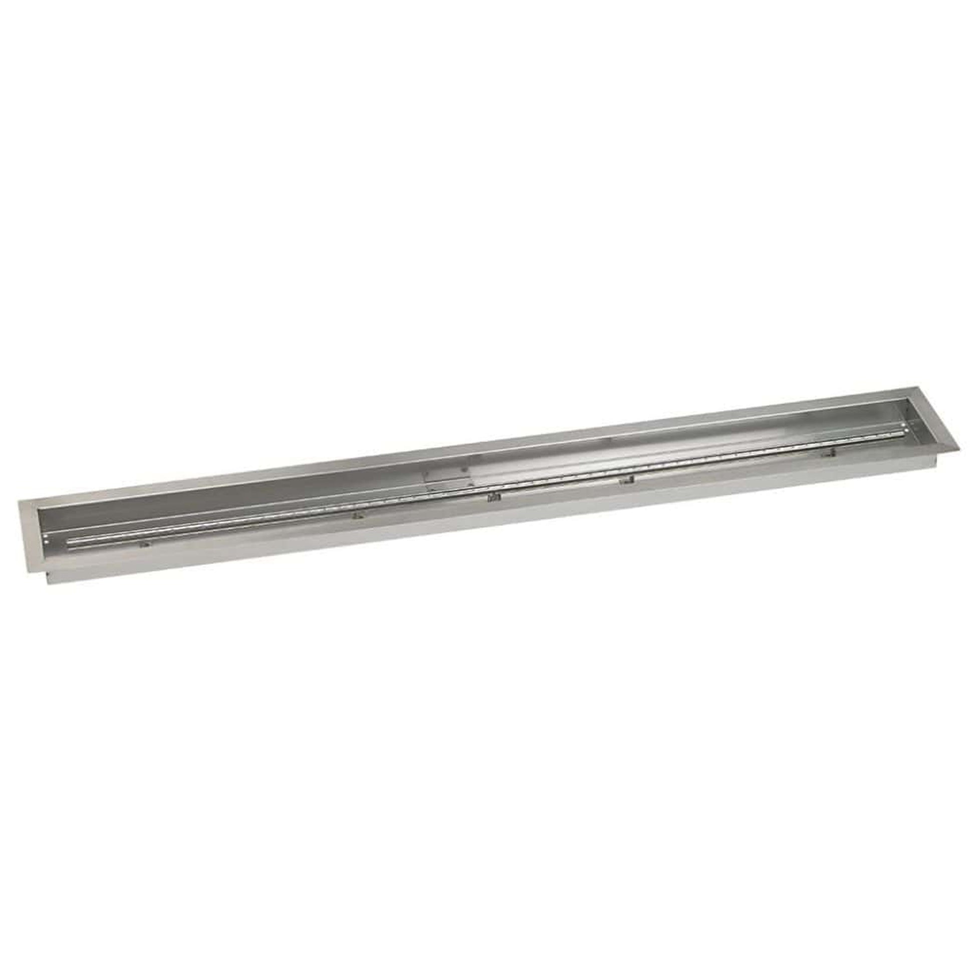 60" x 6" Linear Channel Drop-in Burner Pan w/ Built-in T-Burner - Our 60" x 6" linear drop-in burner pan comes with a convenient 'lip' so it can be installed into your DIY fire pit and easily removed after use. These burner pans greatly reduce the amount of fire glass your customers will need to fill their fire pit by creating a false bottom which gives the illusion that the fire pit is full, whereas only the top part of it is. All our linear drop-in burner pans are made of 304 stainless steel, which means they are very durable and can withstand extreme heat as well as harsh weather without sustaining any damage or rust. Each comes with a built-in T-burner, 1/2 inch gas inlet, and drilled weep holes to prevent water accumulation.