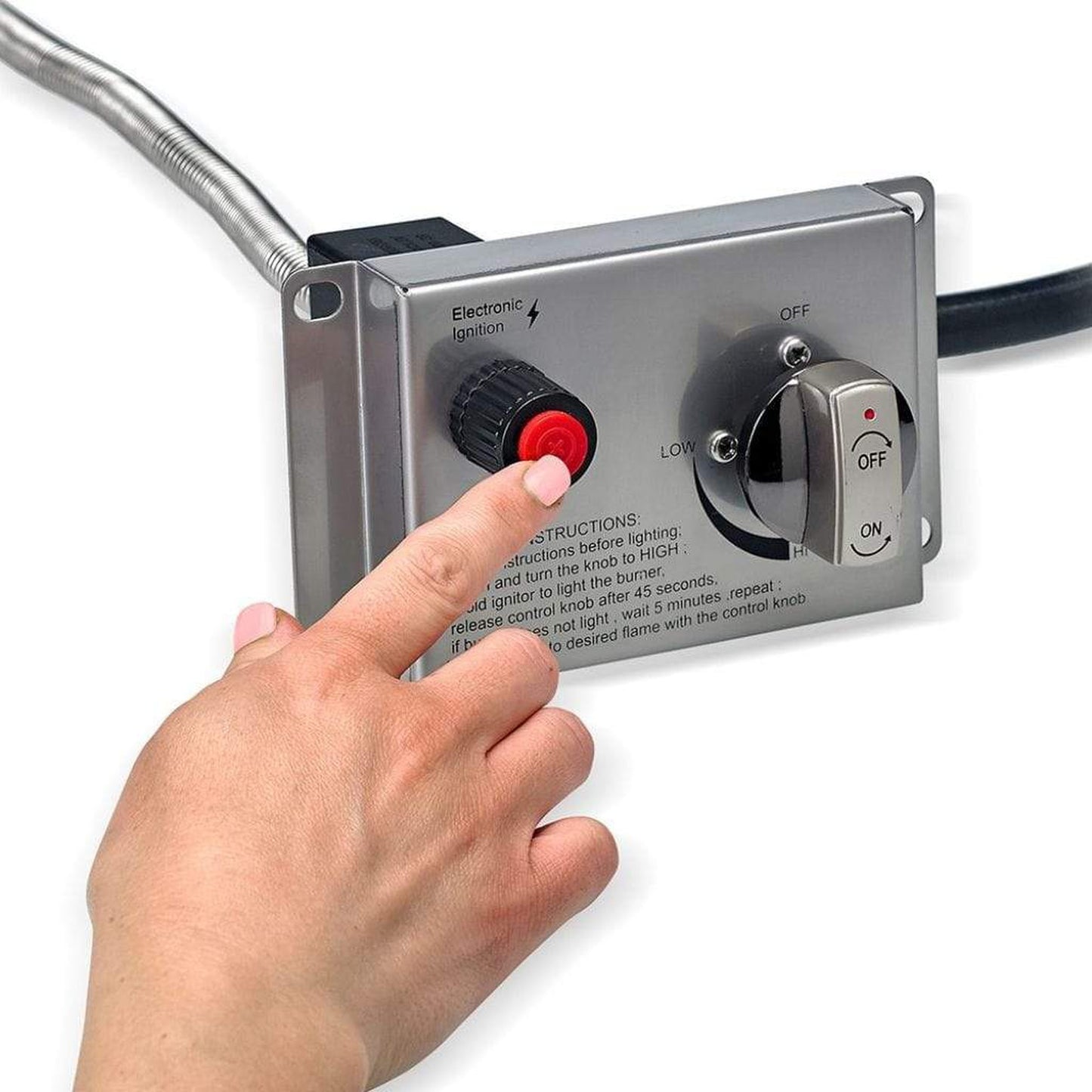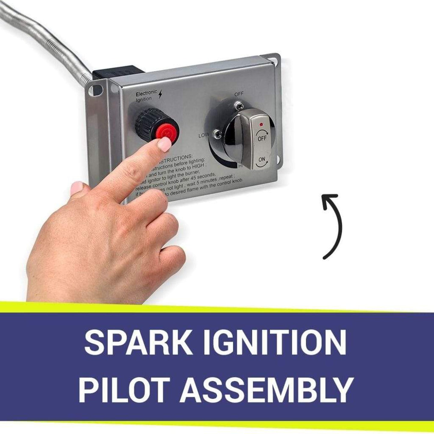 Spark Ignition Pilot Assembly: Battery powered push button ignites the flame using a rapid ignition and thermocouple.