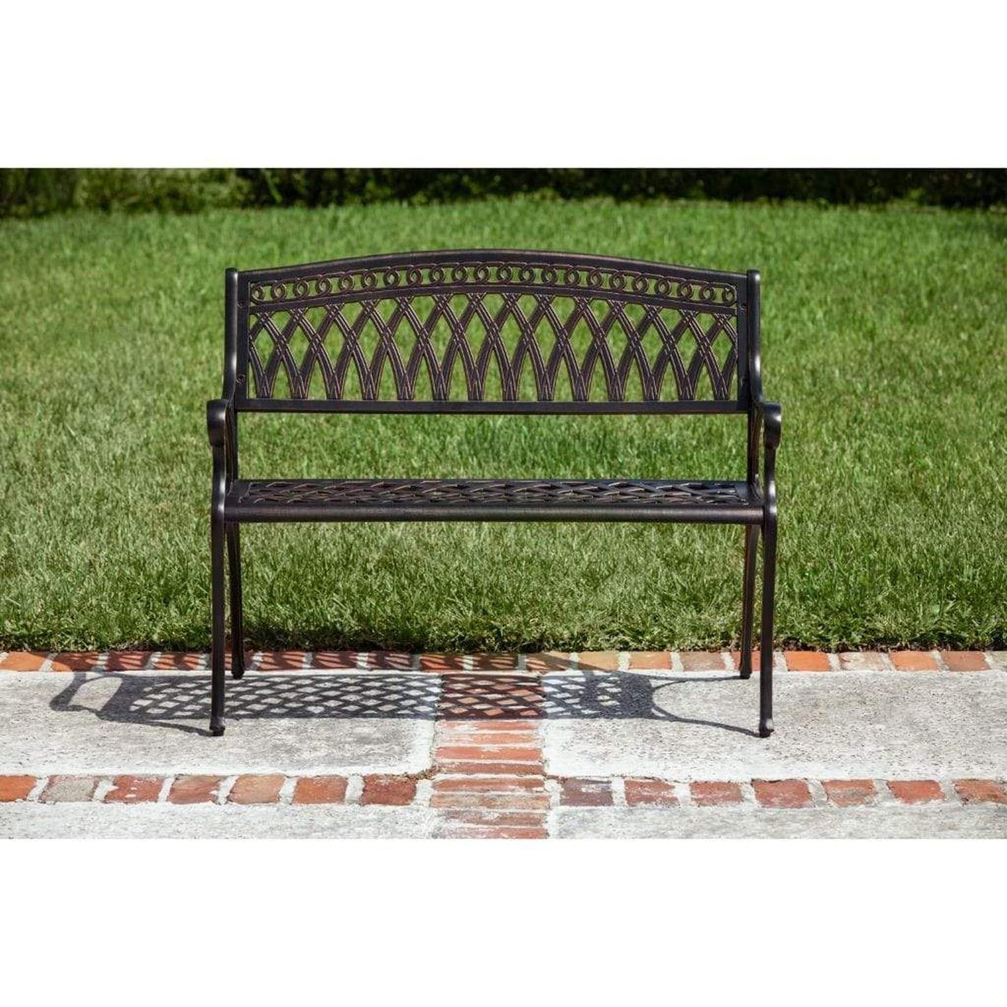 Enjoy the classic beauty of cast iron but the maintenance-free experience of durable solid aluminum. The elegant Simone Patio Bench is constructed of cast aluminum in our unique antique bronze finish. This lightweight yet sturdy bench is perfect for a relaxing pause in the garden or your backyard patio. The attractive Art Deco repeating arch motif with antique bronze finish is the perfect year-round accent for any patio or garden setting.