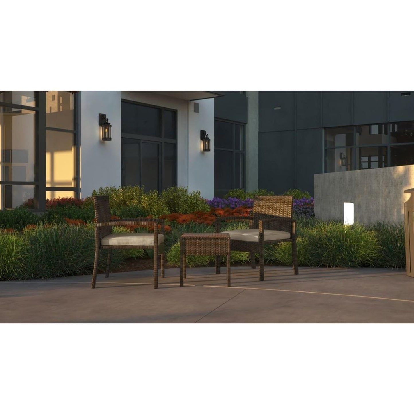 The Bern Wicker Conversation Set is constructed of all weather wicker and includes comfortable light khaki cushions. The lightweight yet durable armchairs and occasional table are perfect for enjoying an evening on the patio or relaxing poolside. The attractive mocha finish is the ideal accent for any patio. This wicker set can be used year-round and provides a maintenance-free outdoor seating experience.