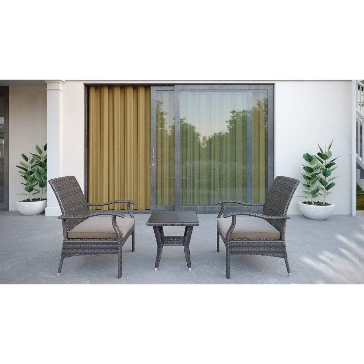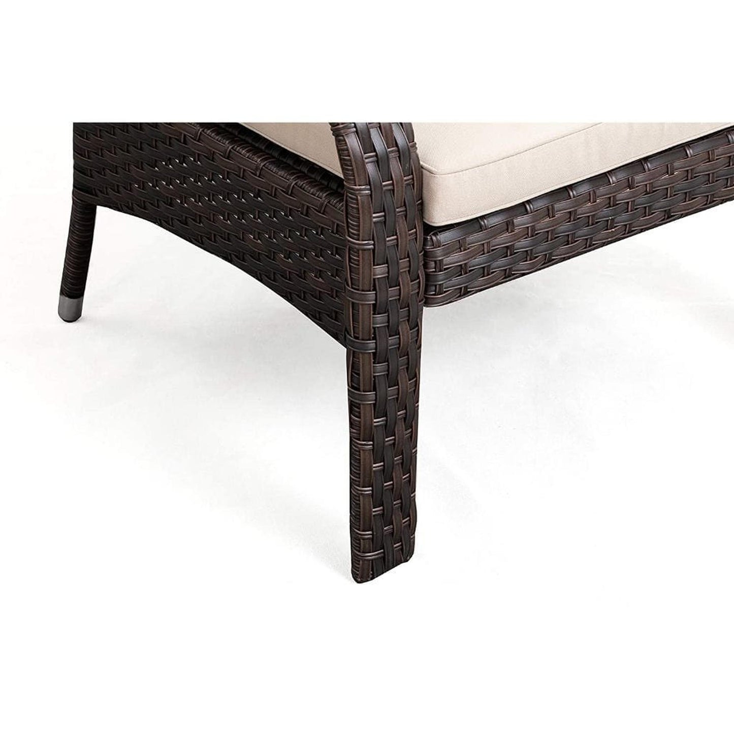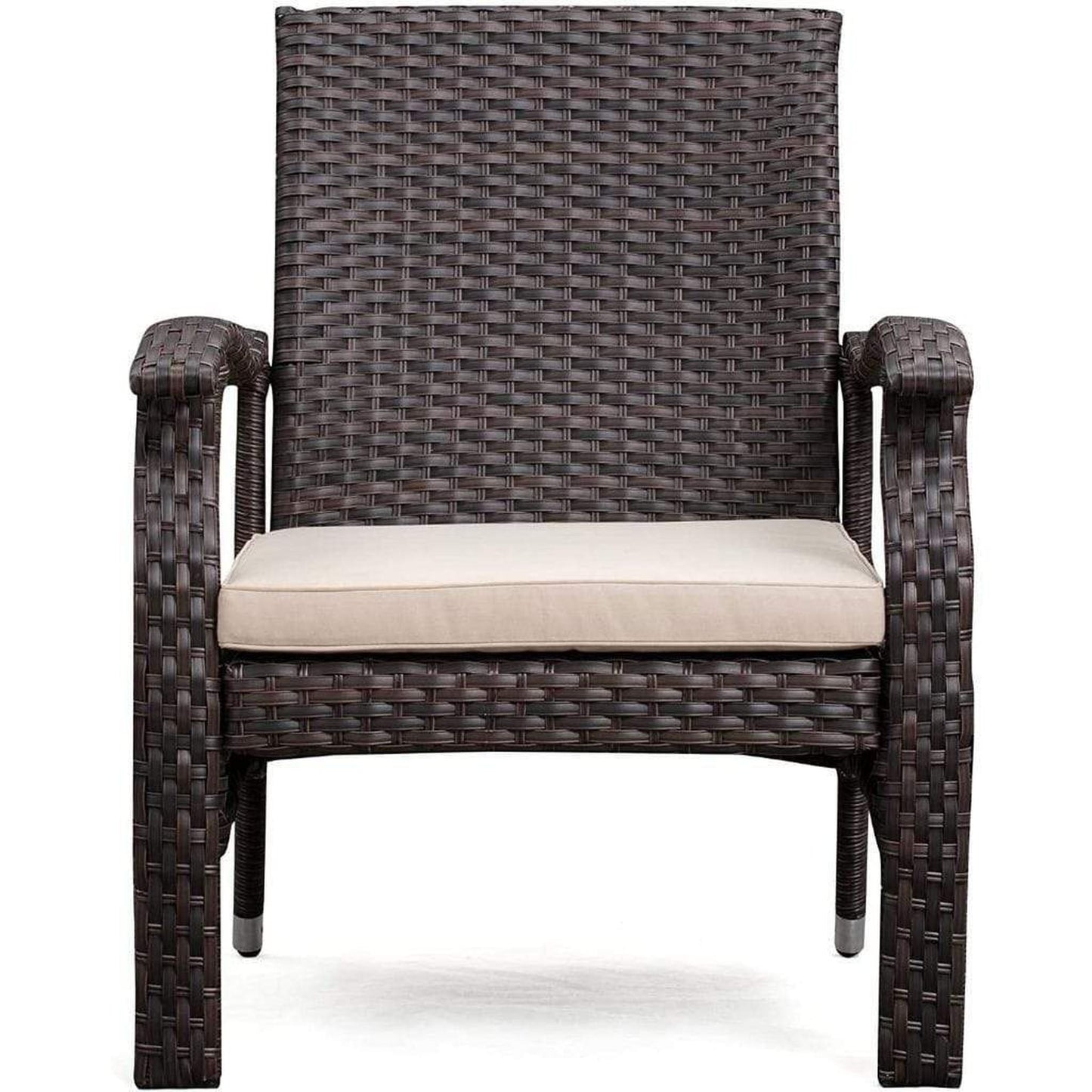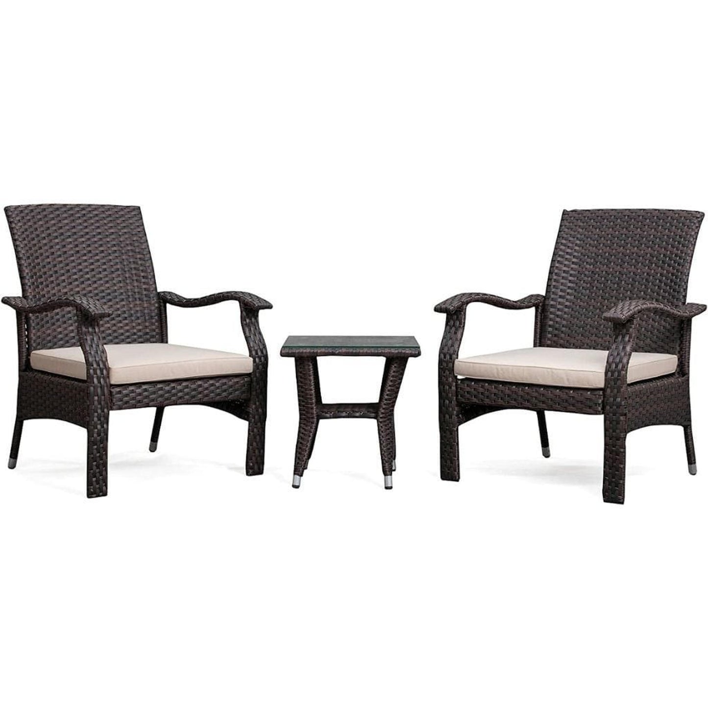 The Miles Wicker Conversation Set is constructed of all-weather wicker and includes comfortable beige cushions. The lightweight yet durable armchairs and glass-topped occasional table are perfect for enjoying an evening on the patio or relaxing poolside. The attractive mocha finish is the ideal accent for any patio. This wicker set can be used year-round and provides a maintenance-free outdoor seating experience.