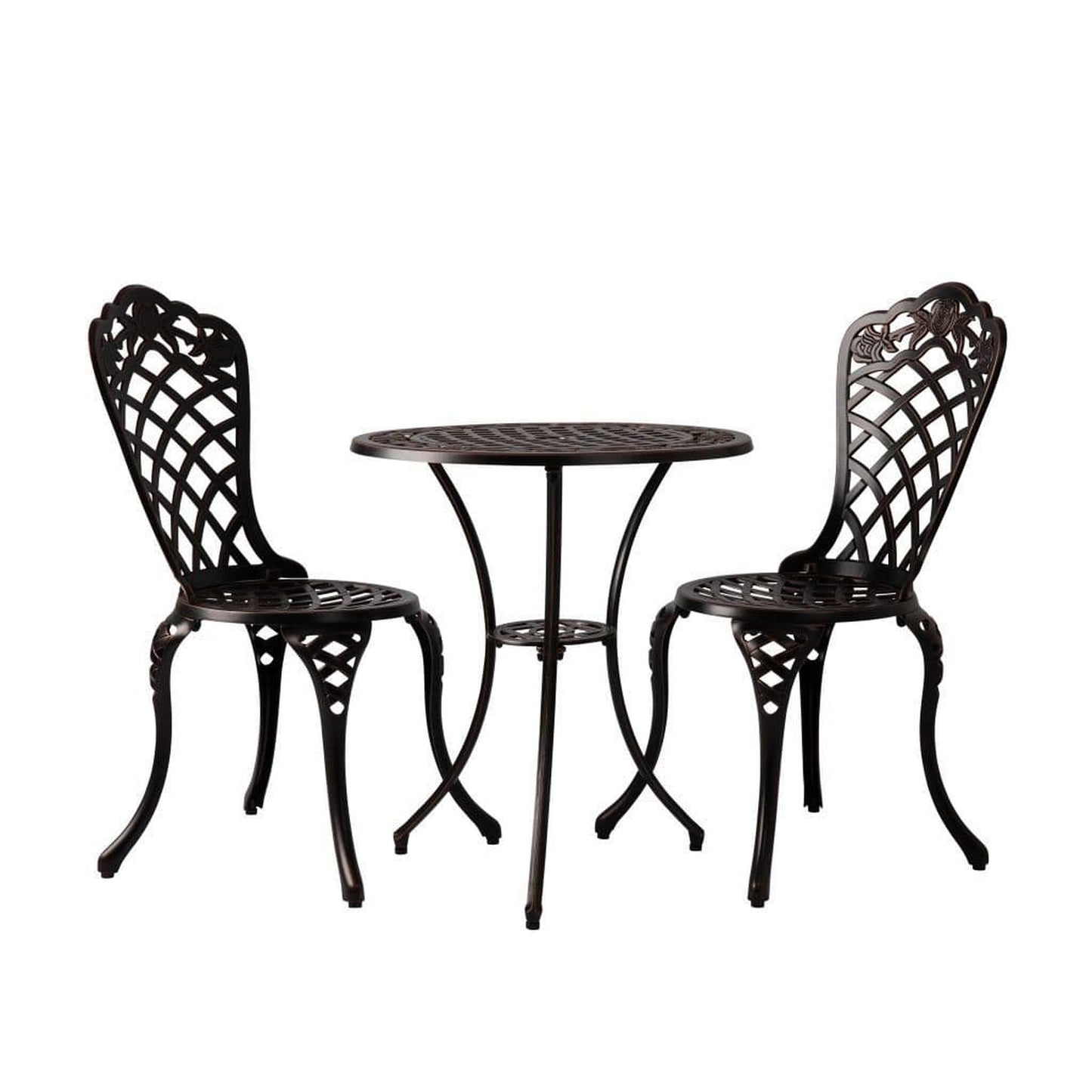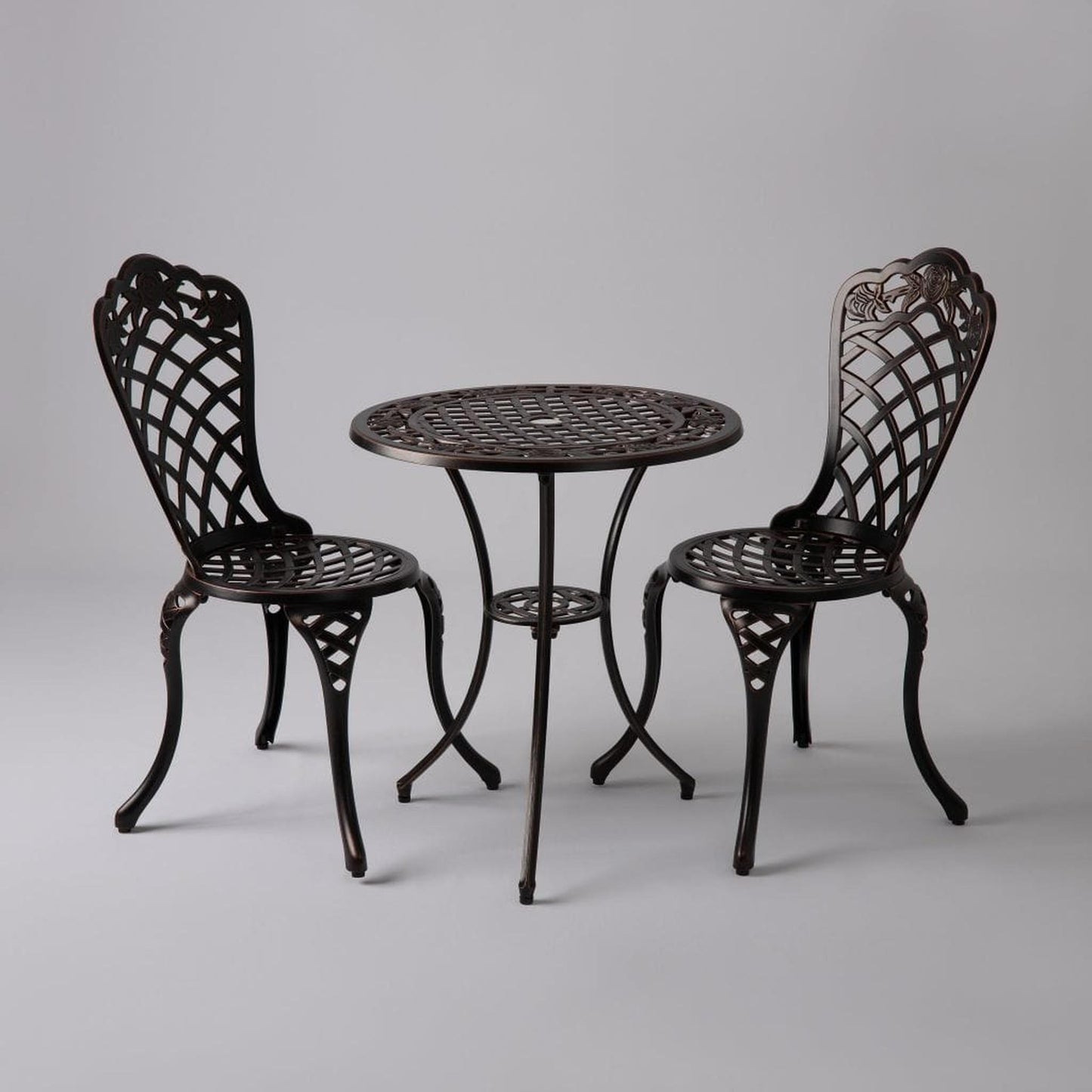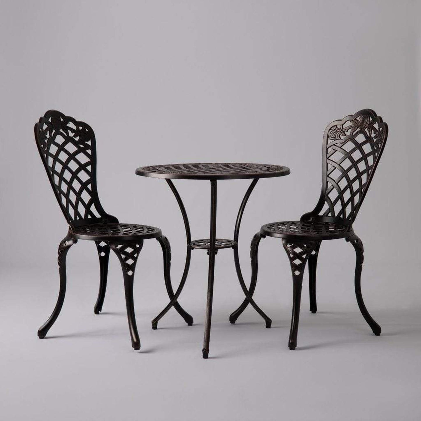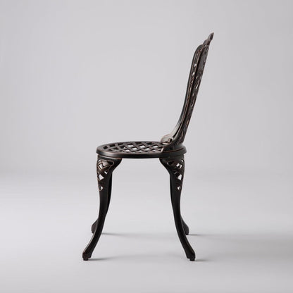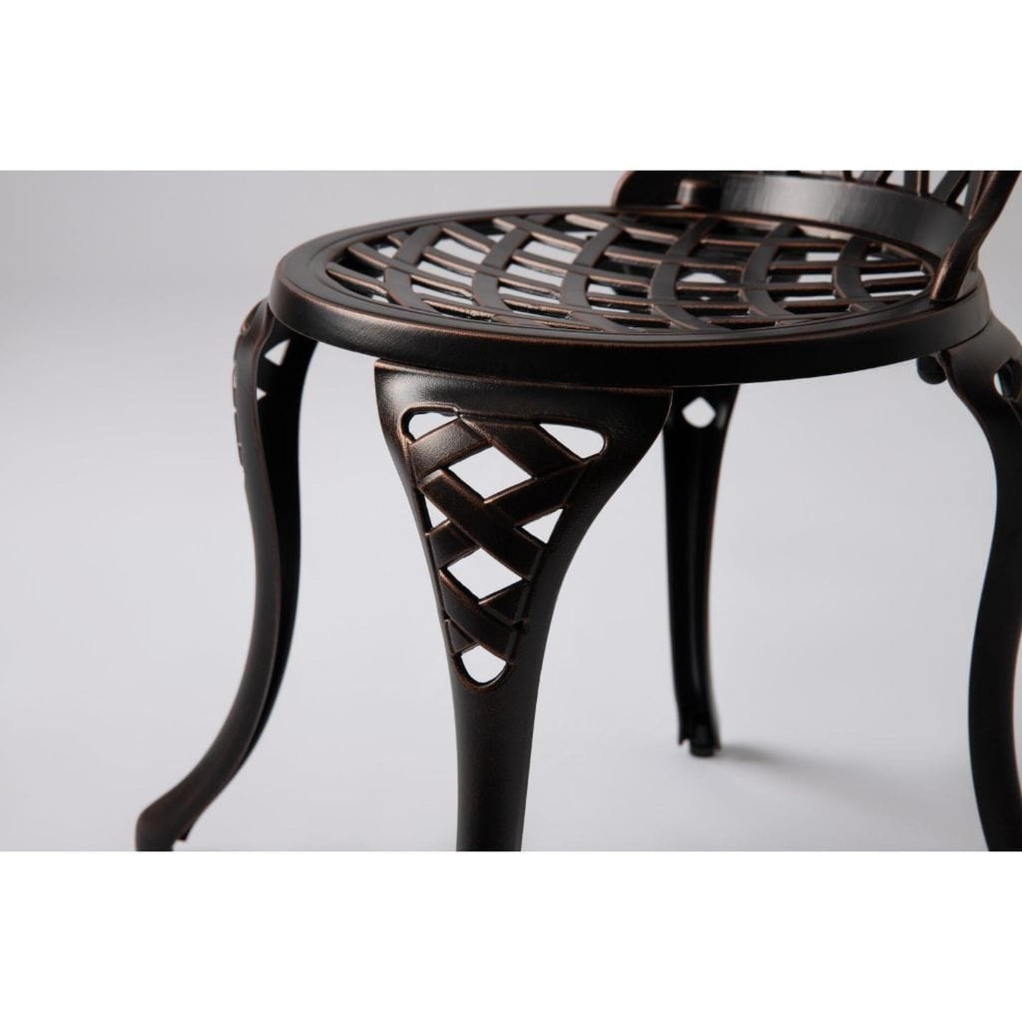 Enjoy the classic beauty of cast iron but the maintenance-free experience of durable solid aluminum. The elegant Scarlet Bistro Set is constructed of cast aluminum in our unique antique bronze finish. This lightweight yet durable bistro set, consisting of a pair of chairs with a matching round café table, is perfect for breakfasts al fresco or an afternoon tea for two. The attractive antique bronze finish is the perfect accent for any patio. Our bistro set can be used year-round and provides a maintenance-free outdoor seating experience.