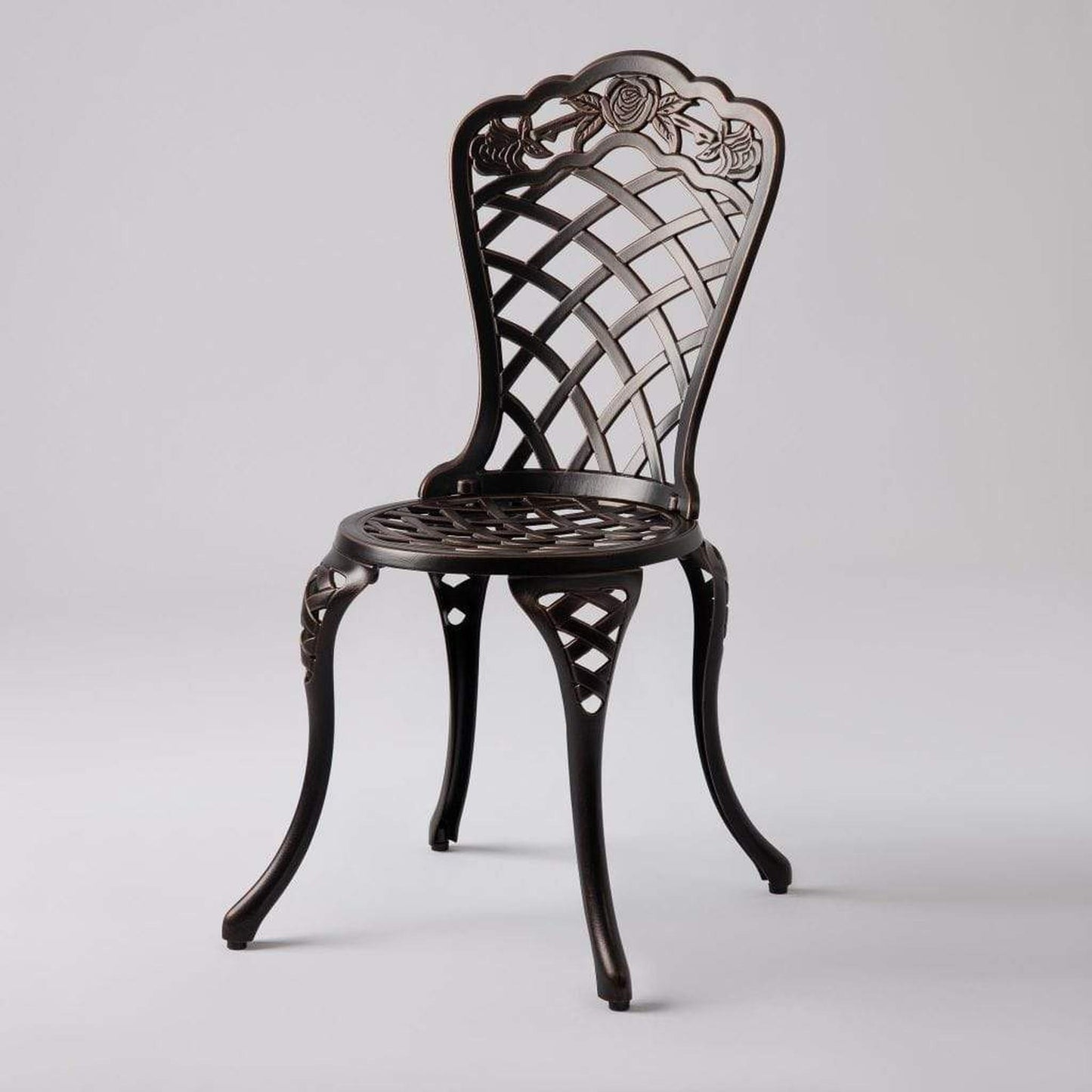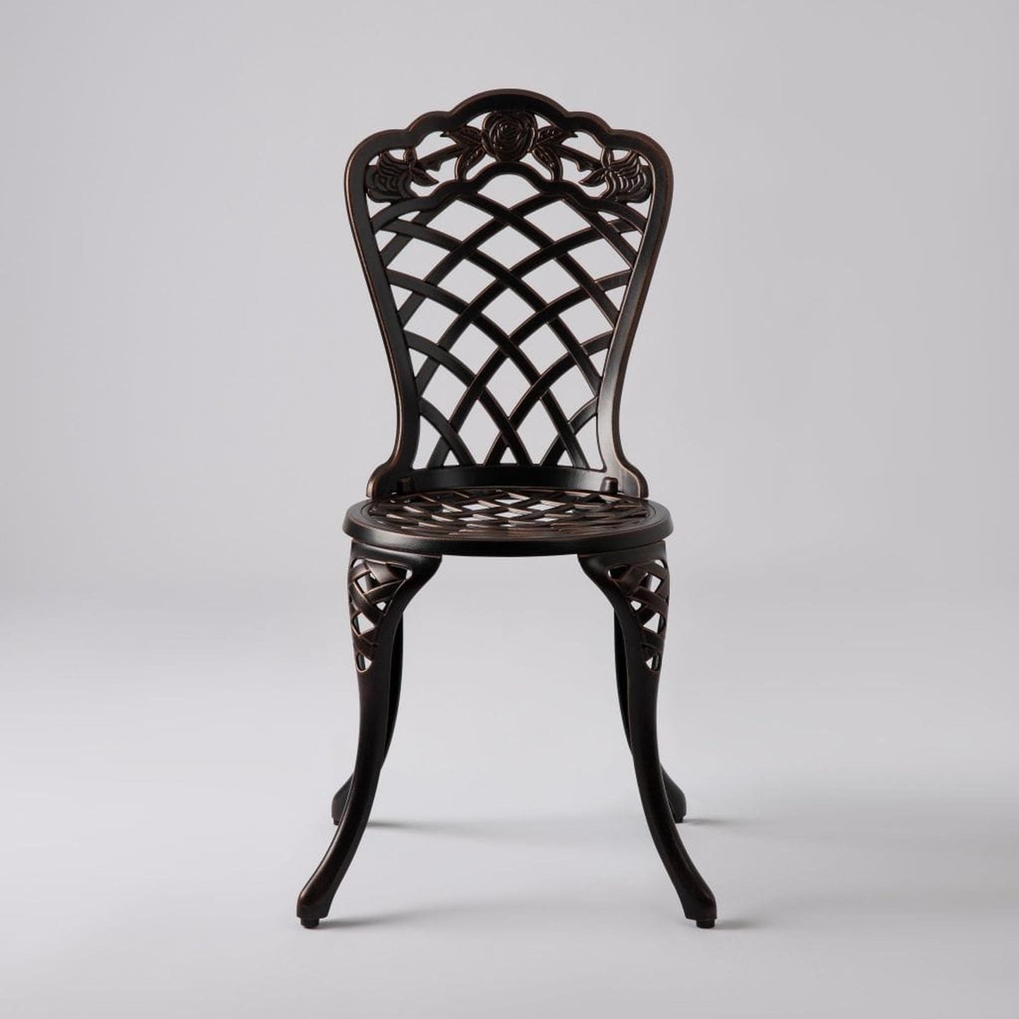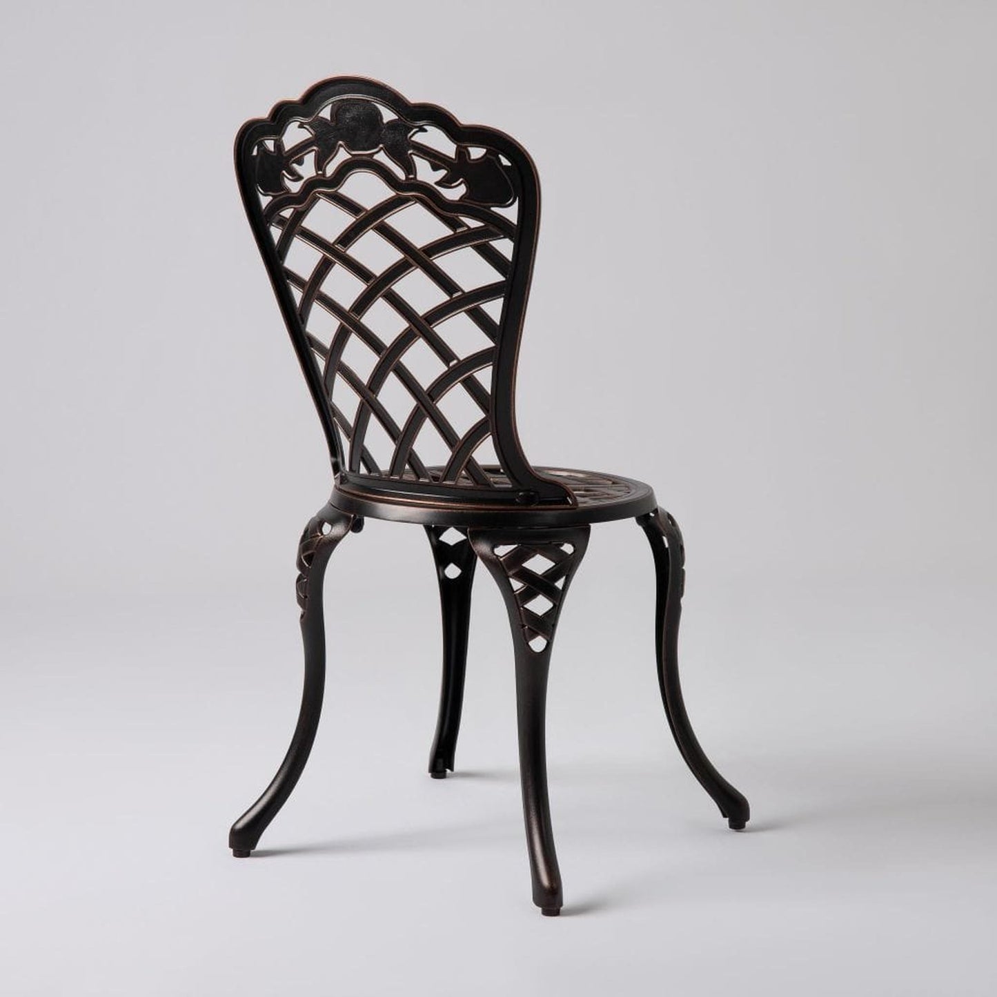 Enjoy the classic beauty of cast iron but the maintenance-free experience of durable solid aluminum. The elegant Scarlet Bistro Set is constructed of cast aluminum in our unique antique bronze finish. This lightweight yet durable bistro set, consisting of a pair of chairs with a matching round café table, is perfect for breakfasts al fresco or an afternoon tea for two. The attractive antique bronze finish is the perfect accent for any patio. Our bistro set can be used year-round and provides a maintenance-free outdoor seating experience.