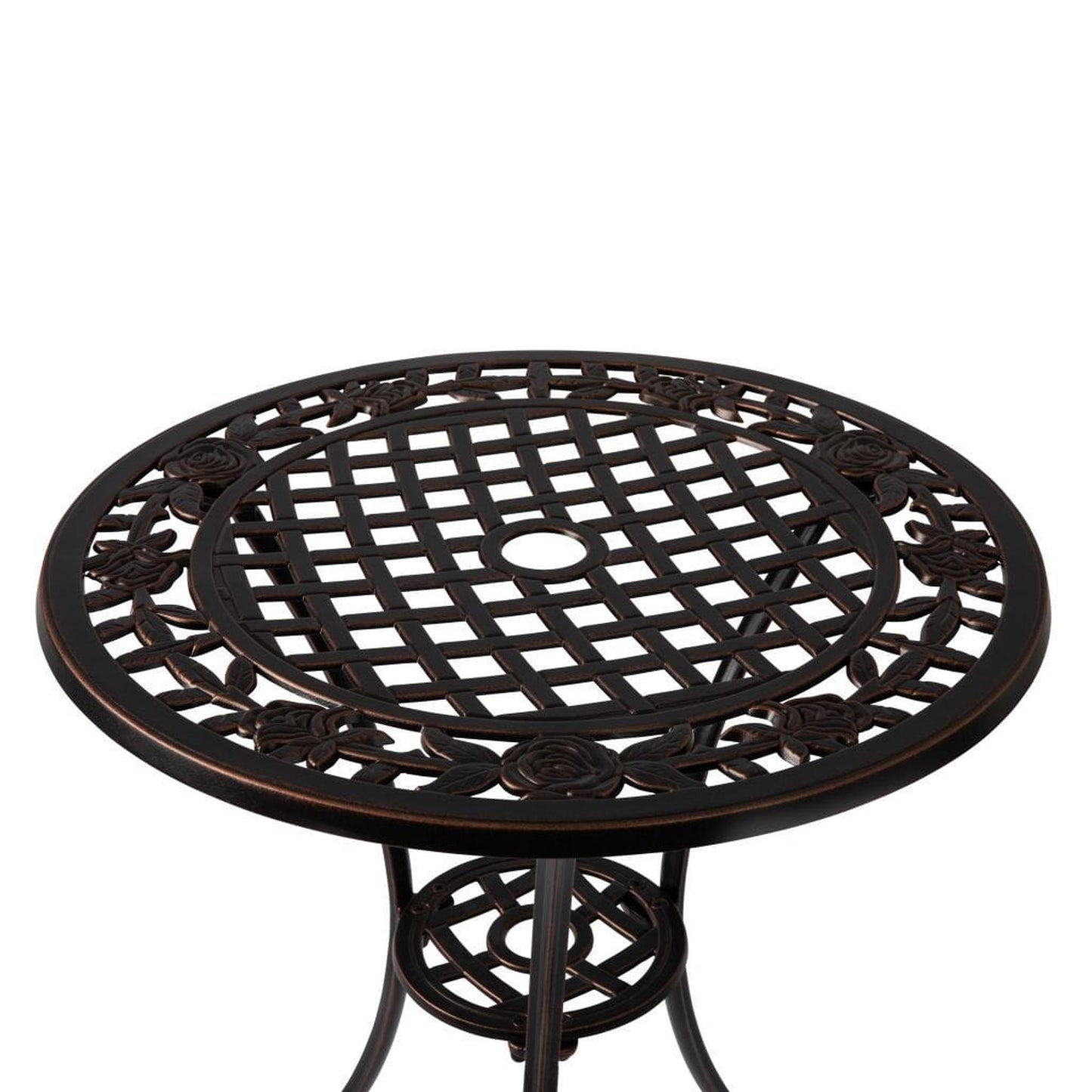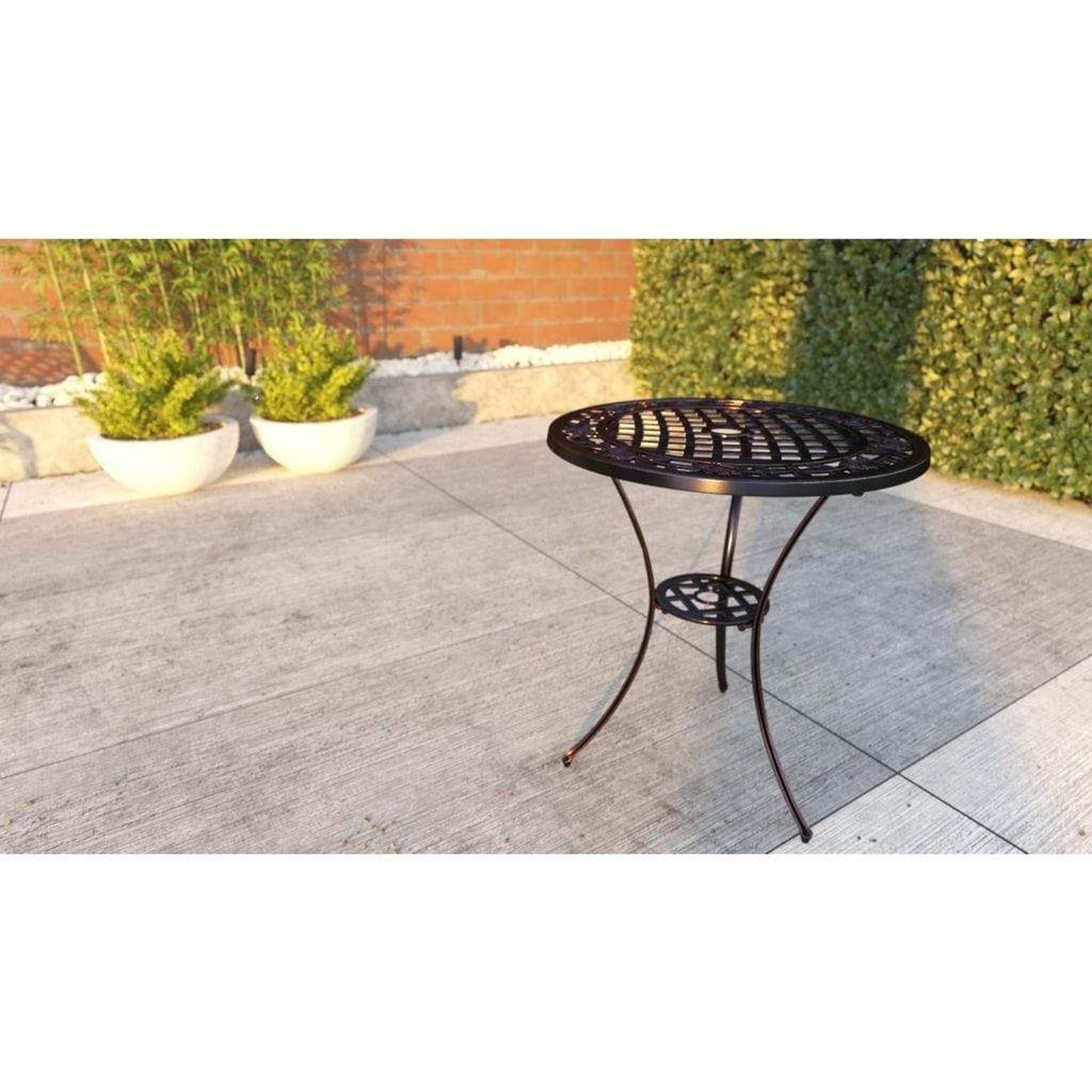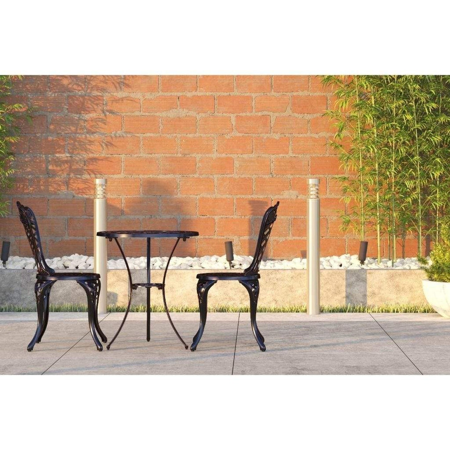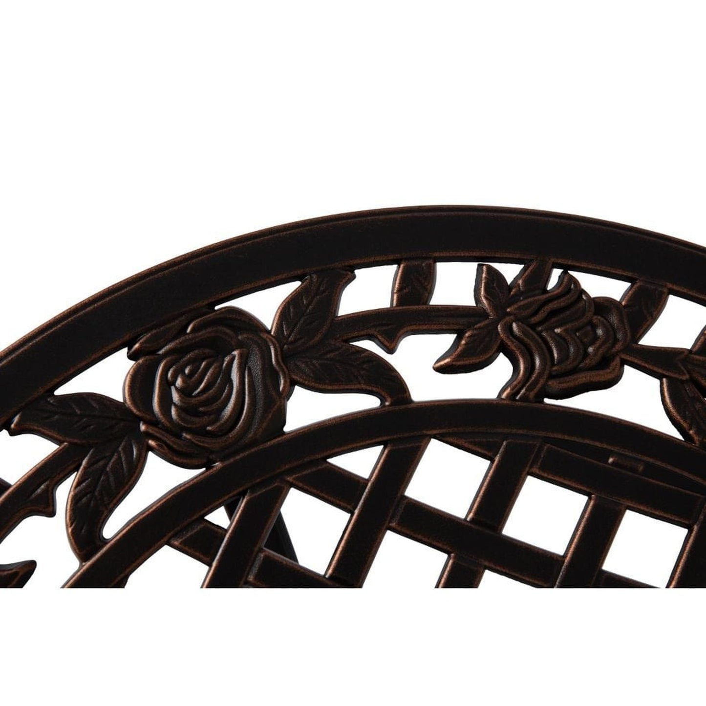 Enjoy the classic beauty of cast iron but the maintenance-free experience of durable solid aluminum. The elegant Scarlet Bistro Set is constructed of cast aluminum in our unique antique bronze finish. This lightweight yet durable bistro set, consisting of a pair of chairs with a matching round café table, is perfect for breakfasts al fresco or an afternoon tea for two. The attractive antique bronze finish is the perfect accent for any patio. Our bistro set can be used year-round and provides a maintenance-free outdoor seating experience.