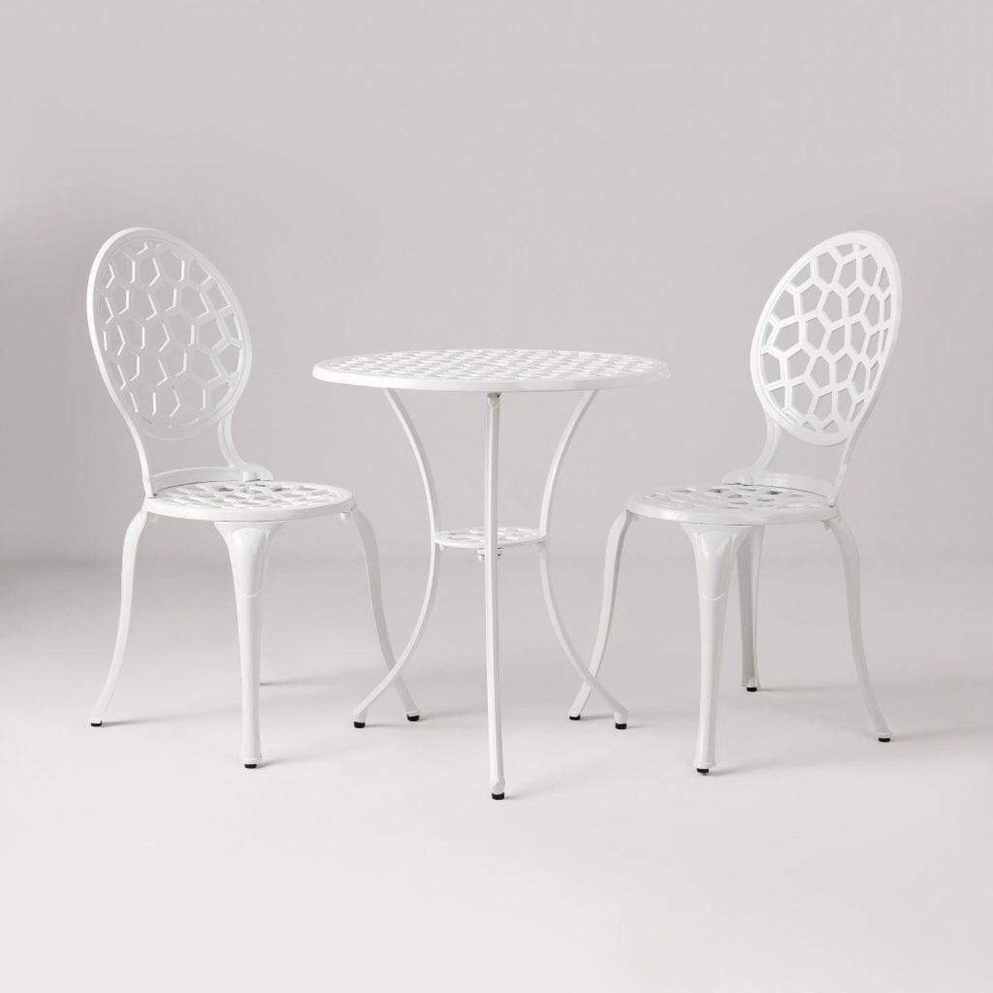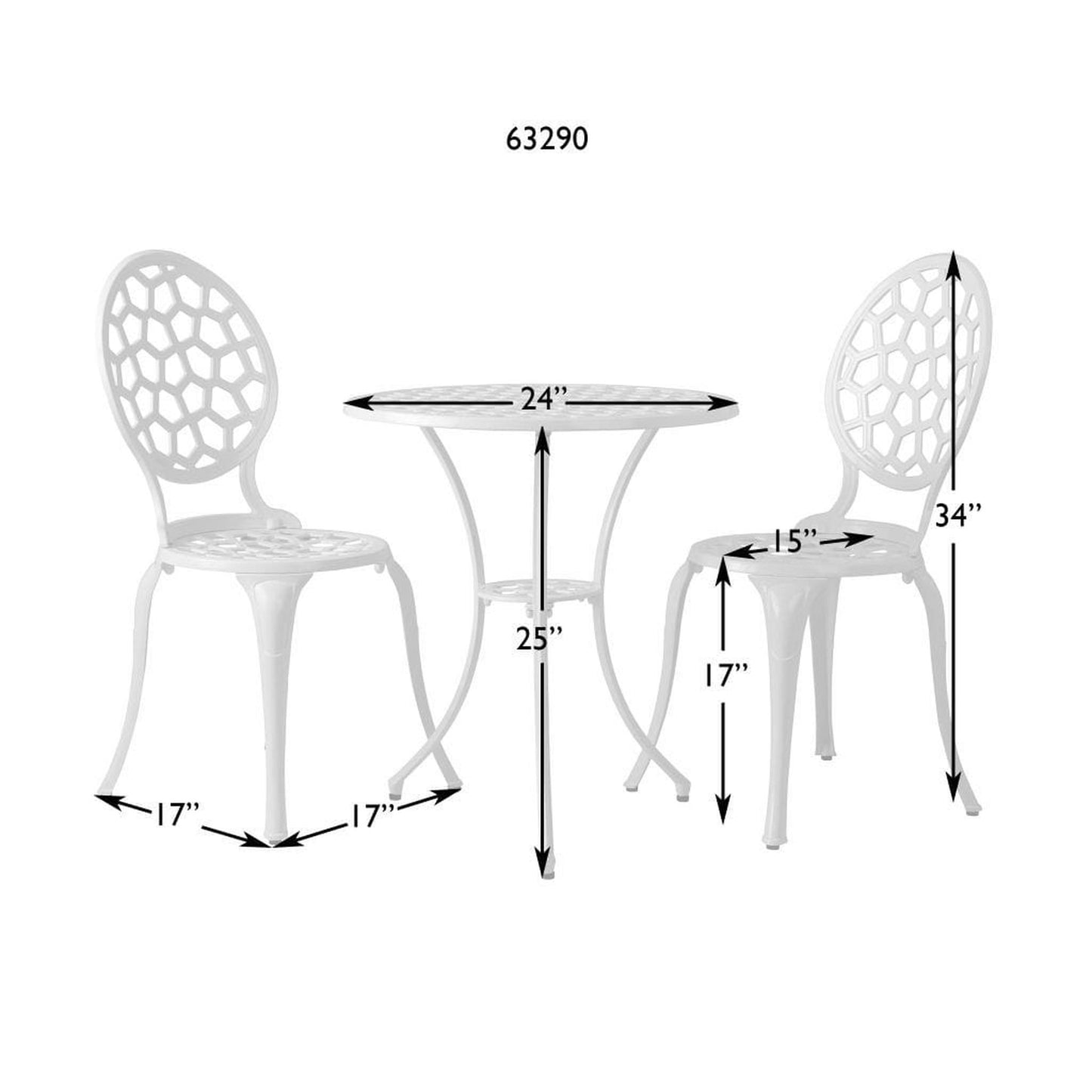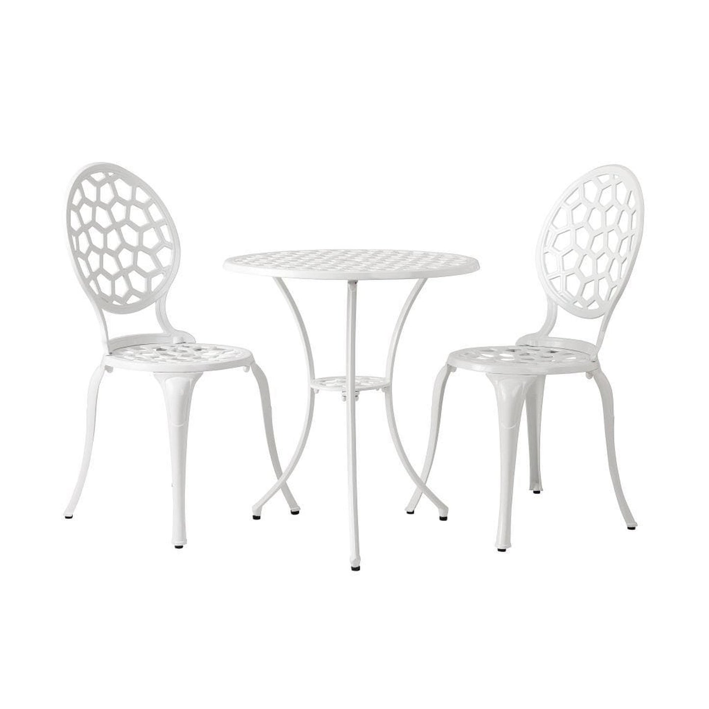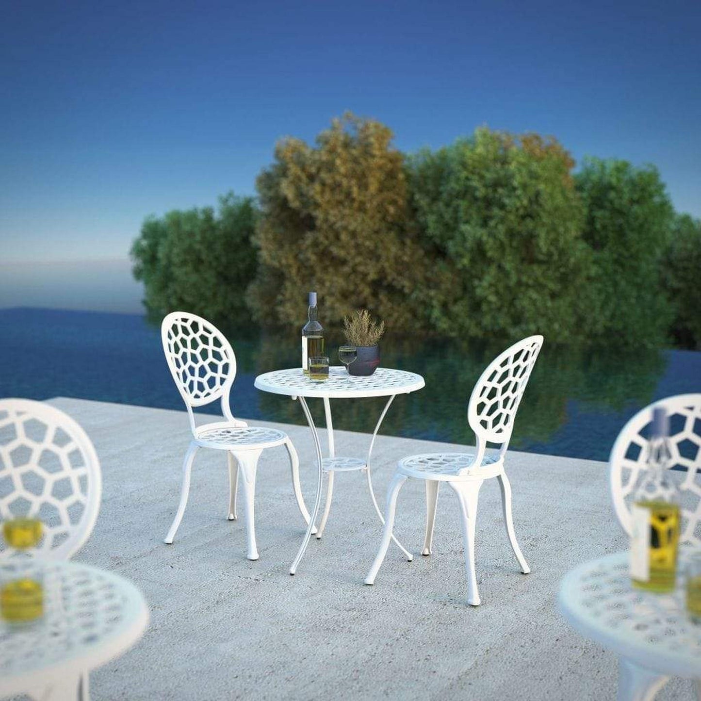 Enjoy the classic look of cast iron with the maintenance-free experience of durable solid aluminum. The cast-iron style Vashon 3-piece Bistro Set includes two chairs and a table in durable cast aluminum. This lightweight yet substantial bistro set is perfect for alfresco breakfasts or an afternoon tea for two. The attractive gloss white finish is the perfect accent for any patio. Our bistro set can be used year-round and provides a maintenance-free outdoor seating experience.