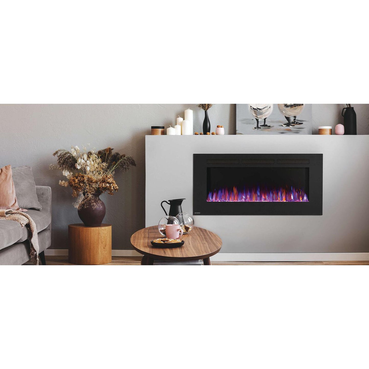 DANCING FLAMES AND COMFORTING WARMTH IN VIRTUALLY ANY ROOM. This plug-and-play, 50-inch electric fireplace is easily hung on the wall like a piece of art to heat spaces up to 400 sq. ft.
