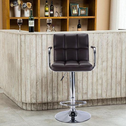 This set of 2 swivel bar stools with arms is perfect to decorate your living room and also adds a contemporary touch to your office bar or restaurant. Made of PU leather the bar stools set is wear-resistant anti-aging breathable and no peculiar smell. The base and footrest are constructed of chromed steel which makes the stool durable and stable. The quadrate cushion is filled with high-density stereotypes sponges. The backrest and metal armrests offer extra comfort. The height can be adjusted easily and safely by a handle and the bar stool can swivel 360 degrees. What's more it also has a 16" rubber ring bottom to prevent floor from scratching. Assembly is easy. This set contains 2 stools and includes an accessory pack. Don't hesitate to buy it now!