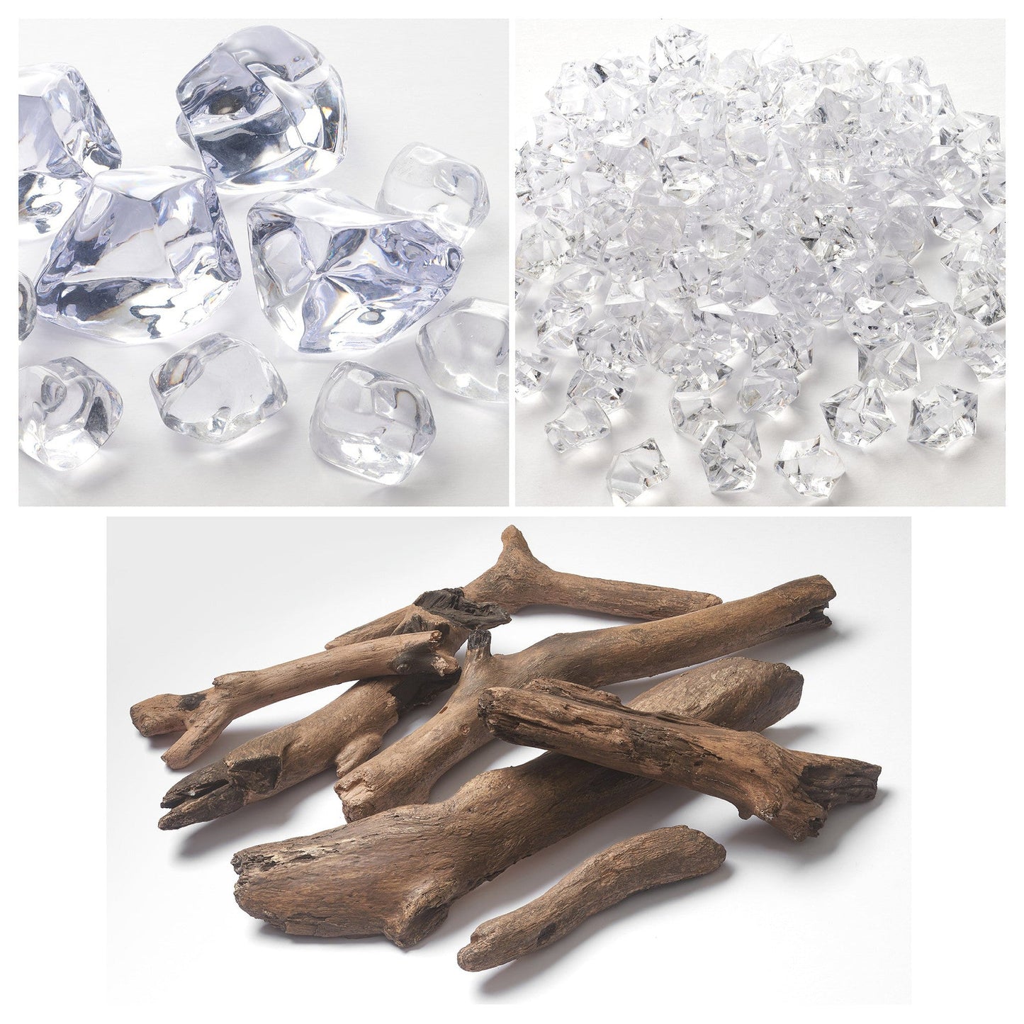 - The stylish multi-media bed includes small and large acrylic crystals with natural-looking driftwood