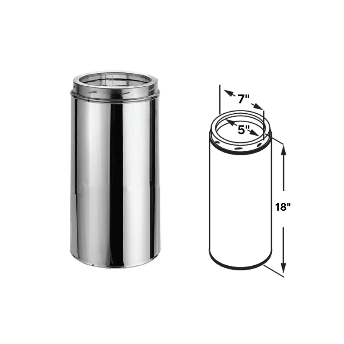 5”, 6" 7", or 8” diameter pipe features an inner wall of .020” 430 stainless steel. Outer wall options of .016” 430 stainless steel or .021” galvalume steel. Refractory insulation is encased between walls. Stainless steel end rings seal the pipe.