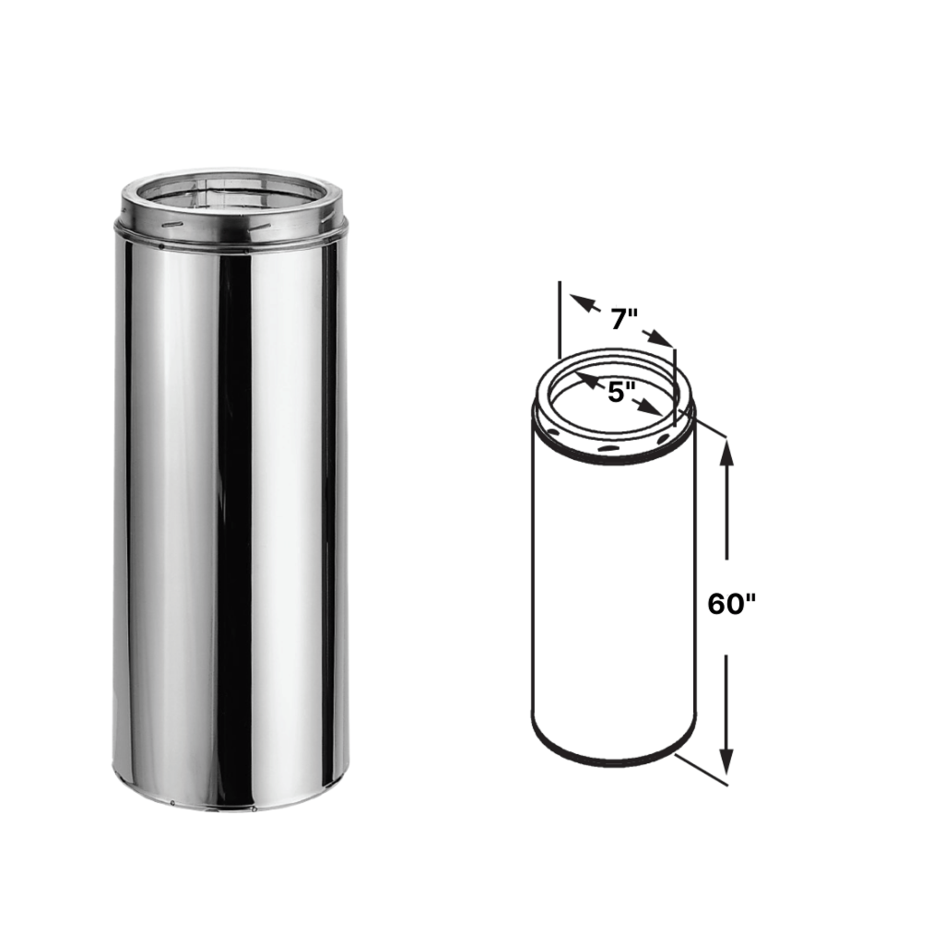 5”, 6" 7", or 8” diameter pipe features an inner wall of .020” 430 stainless steel. Outer wall options of .016” 430 stainless steel or .021” galvalume steel. Refractory insulation is encased between walls. Stainless steel end rings seal the pipe.