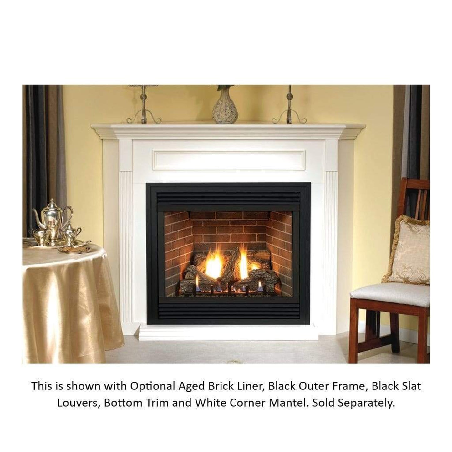 Please Note: Picture Shown Tahoe Premium Direct-Vent Fireplace with White Corner Mantel, Optional Aged Brick Liner, Black Outer Frame, Black Slat Louvers, and Bottom Trim. Not Included (Sold Separately).