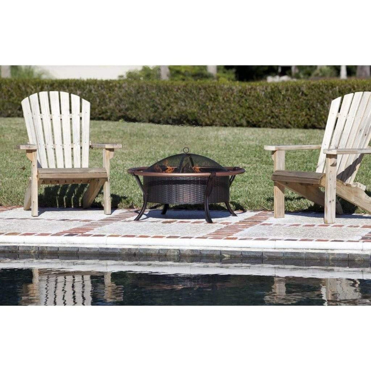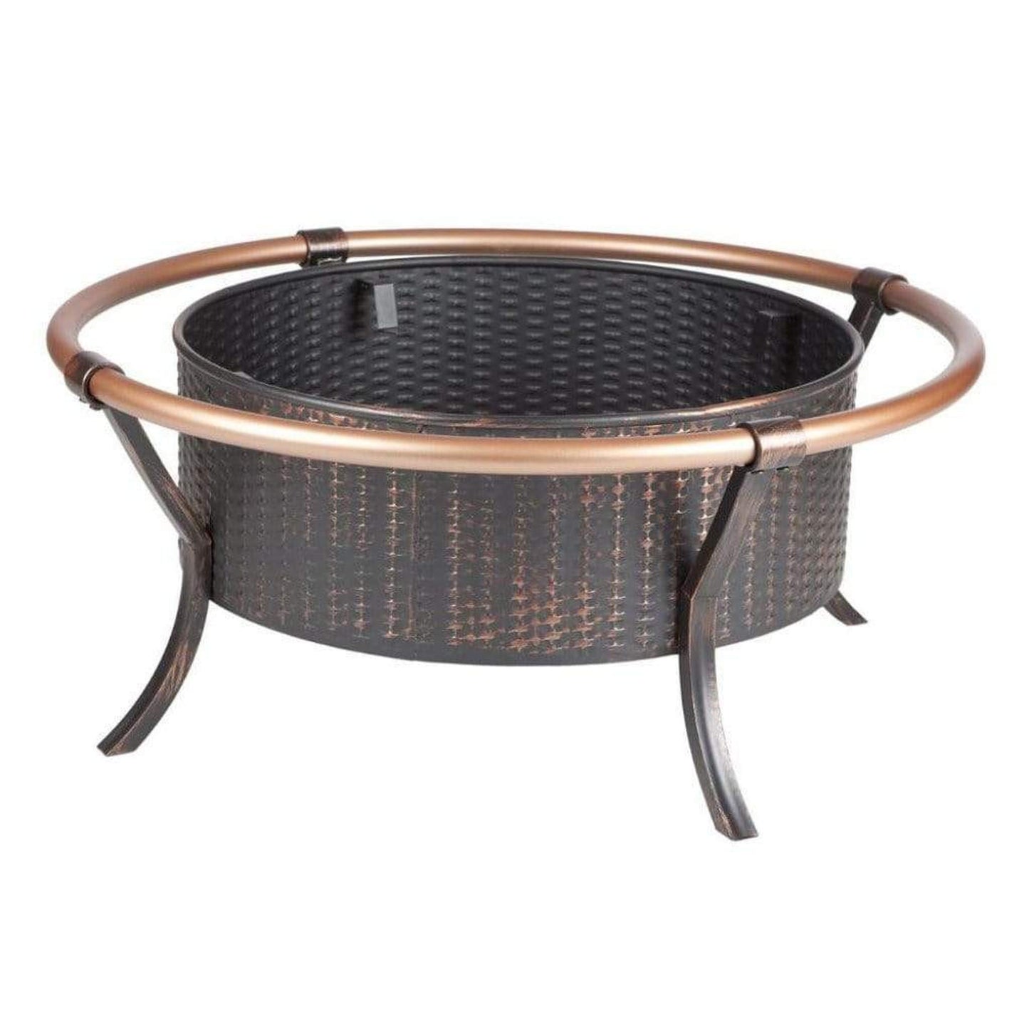 This unique fire pit features a 27.5" antique bronze painted steel fire bowl with an attractive weave pattern, and elegant copper finish outer rail. This fire pit comes complete with mesh fire screen with high heat paint, and powder coated legs. Also included is a screen lift tool.