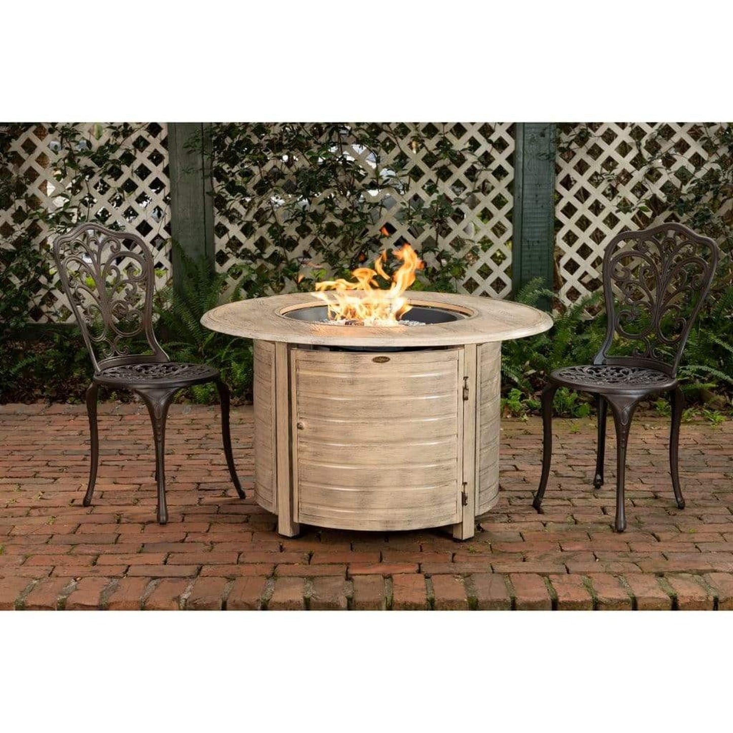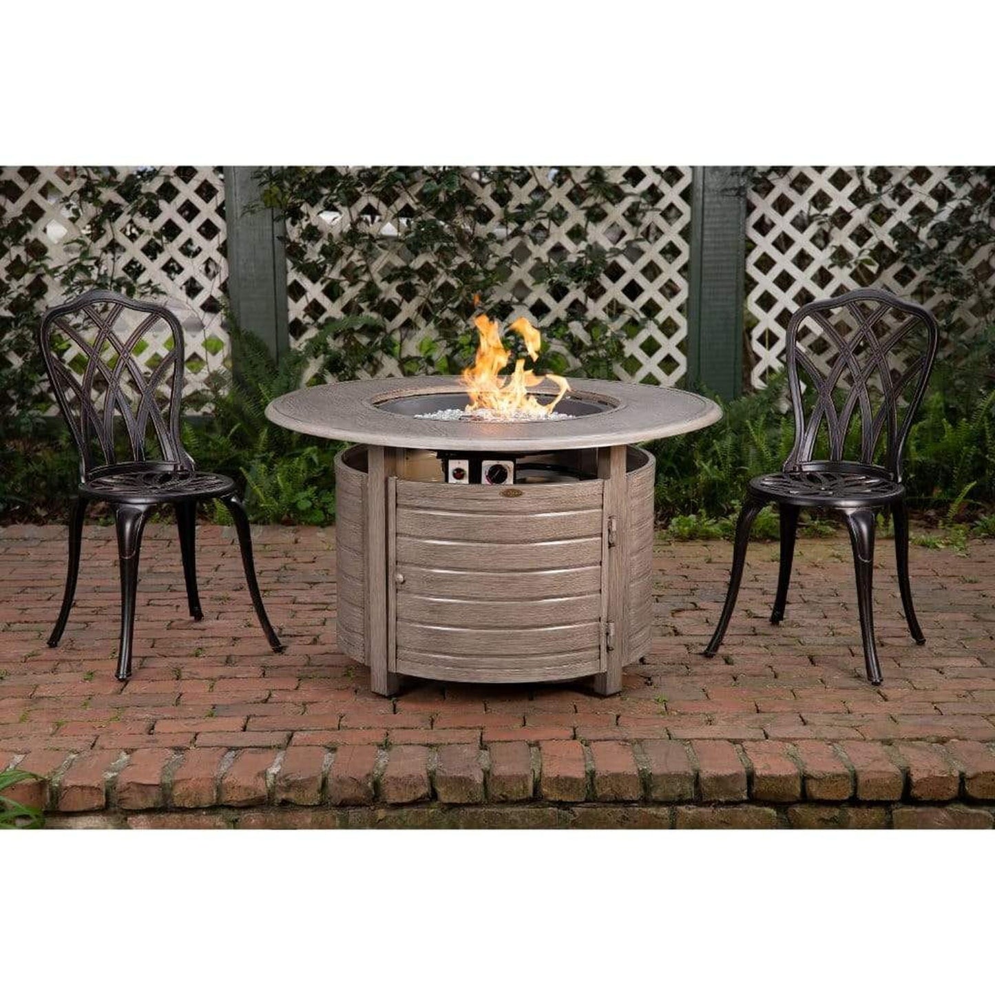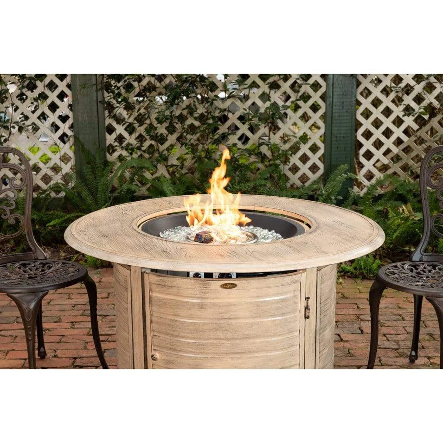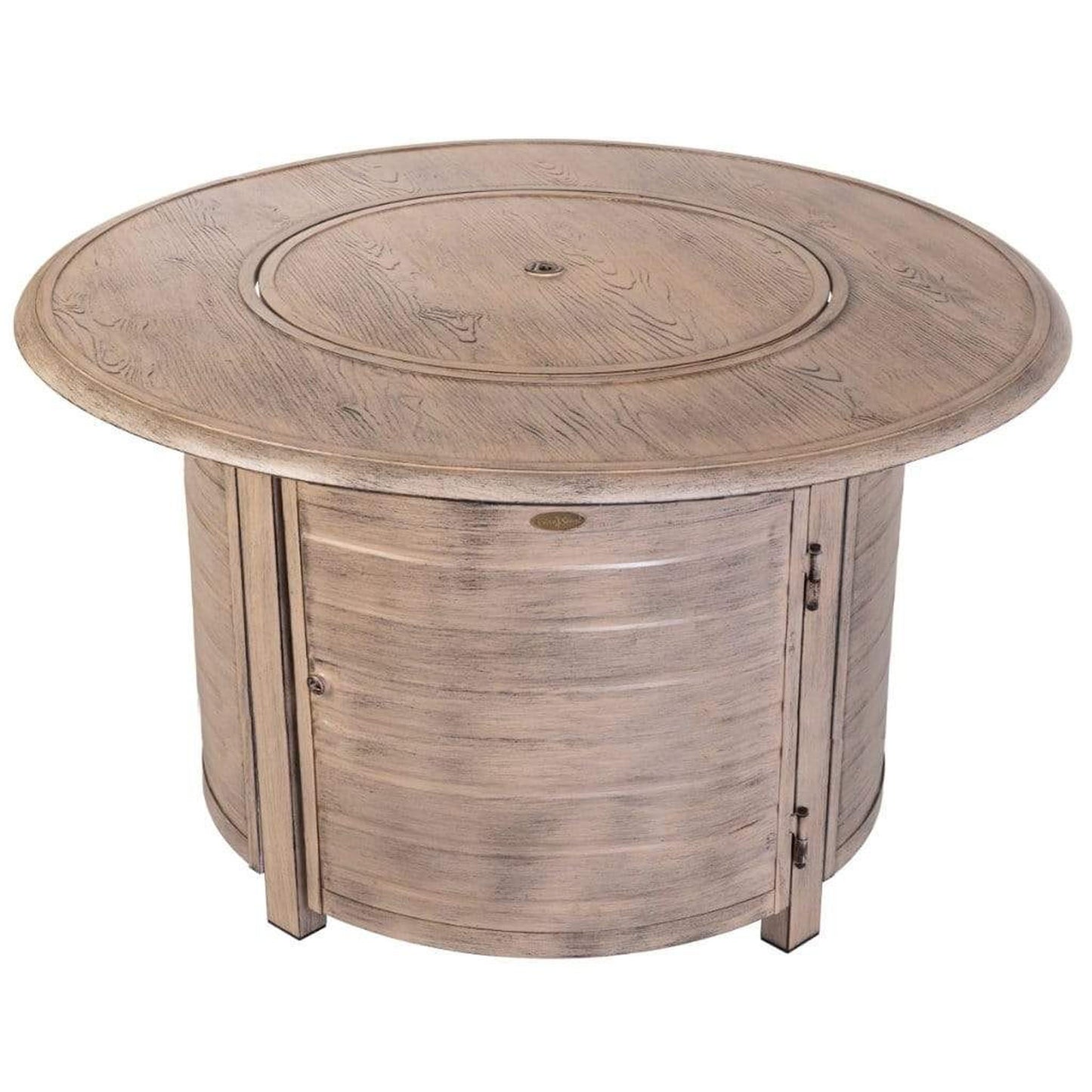 The Thatcher Round Gas Fire Pit boasts a three-dimensional woodgrain motif in an antique bronze or driftwood or barnwood finish that will be right at home in your outdoor space. With a practical aluminum build and an output of 50,000 BTU, this versatile fire pit pulls double duty in warmer weather as a patio table when covered with the included fire bowl lid. Arriving with clear fire glass for a stylish touch, just add a standard 20 lb propane tank behind the handy hinged door. A nylon cover for the fire pit is included for your convenience.