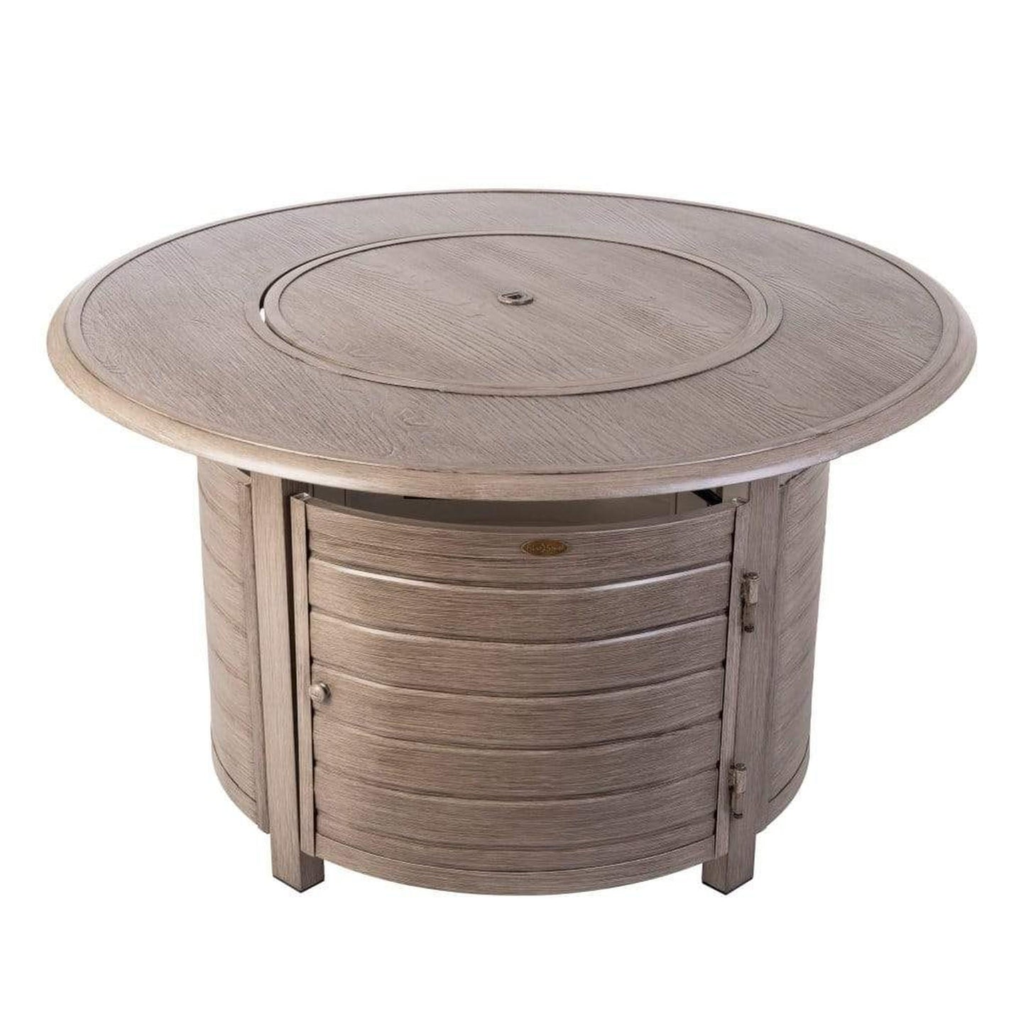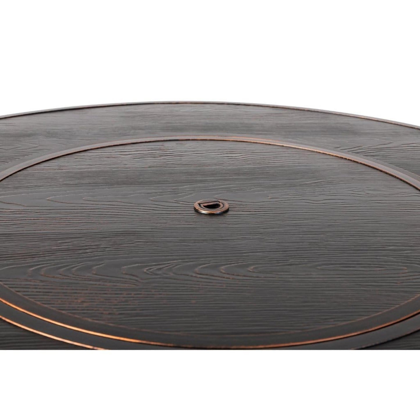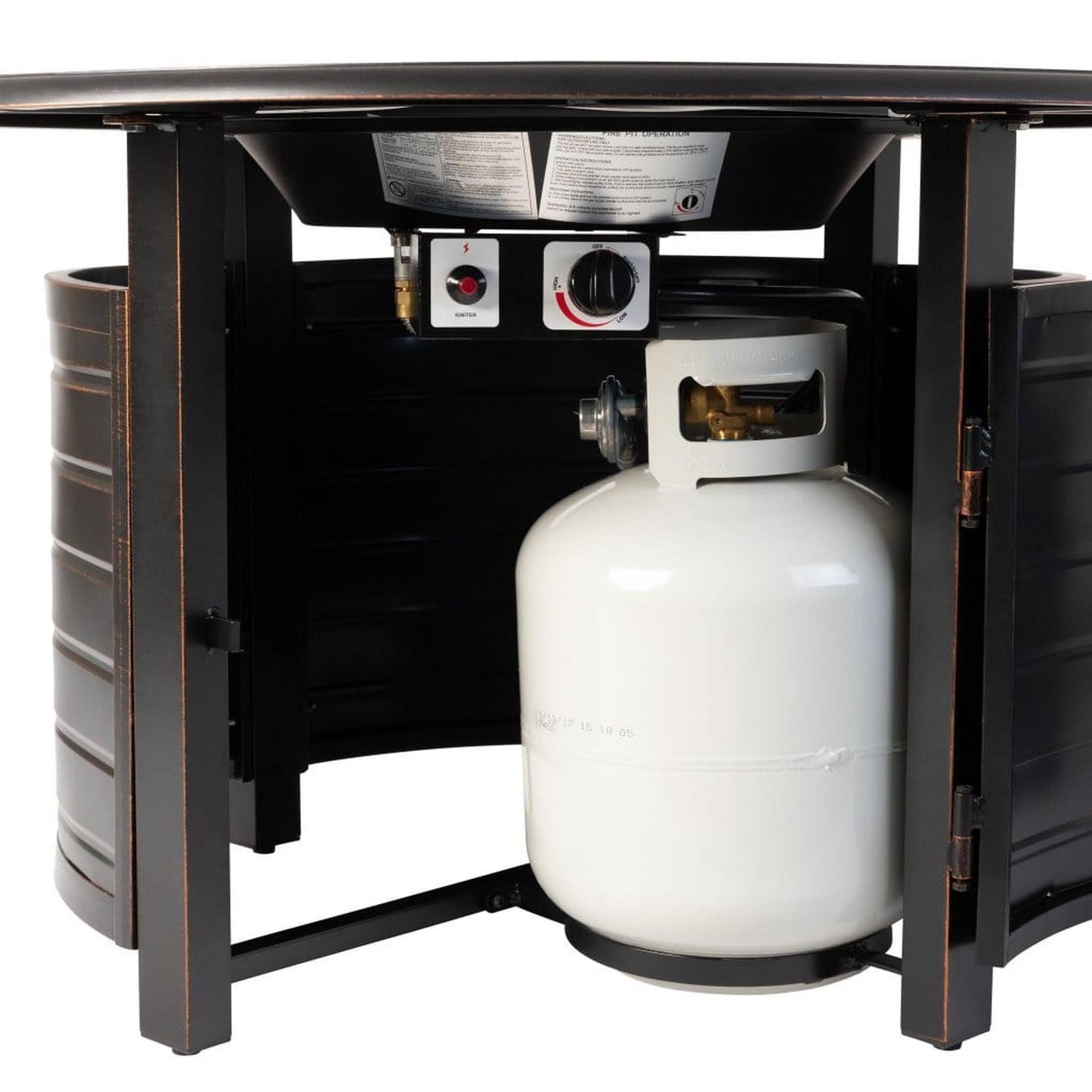 The Thatcher Round Gas Fire Pit boasts a three-dimensional woodgrain motif in an antique bronze or driftwood or barnwood finish that will be right at home in your outdoor space. With a practical aluminum build and an output of 50,000 BTU, this versatile fire pit pulls double duty in warmer weather as a patio table when covered with the included fire bowl lid. Arriving with clear fire glass for a stylish touch, just add a standard 20 lb propane tank behind the handy hinged door. A nylon cover for the fire pit is included for your convenience.