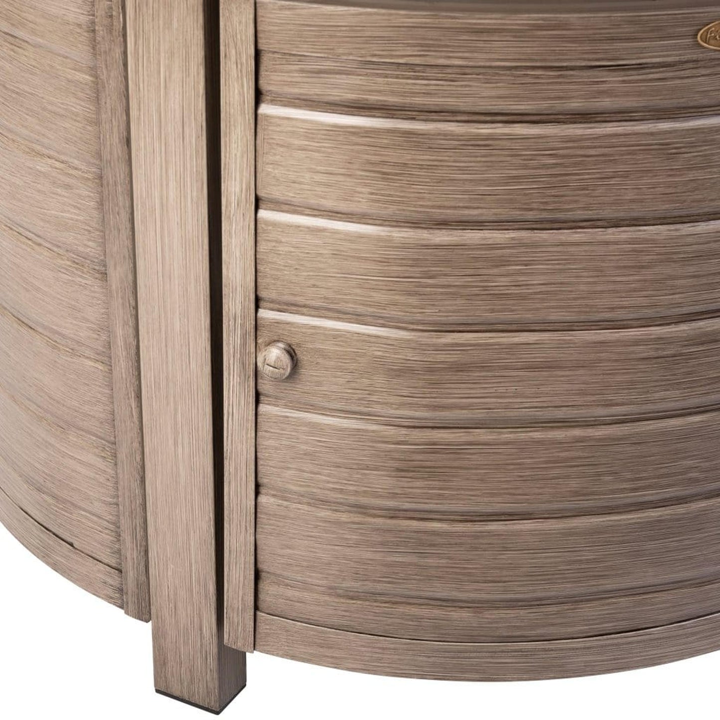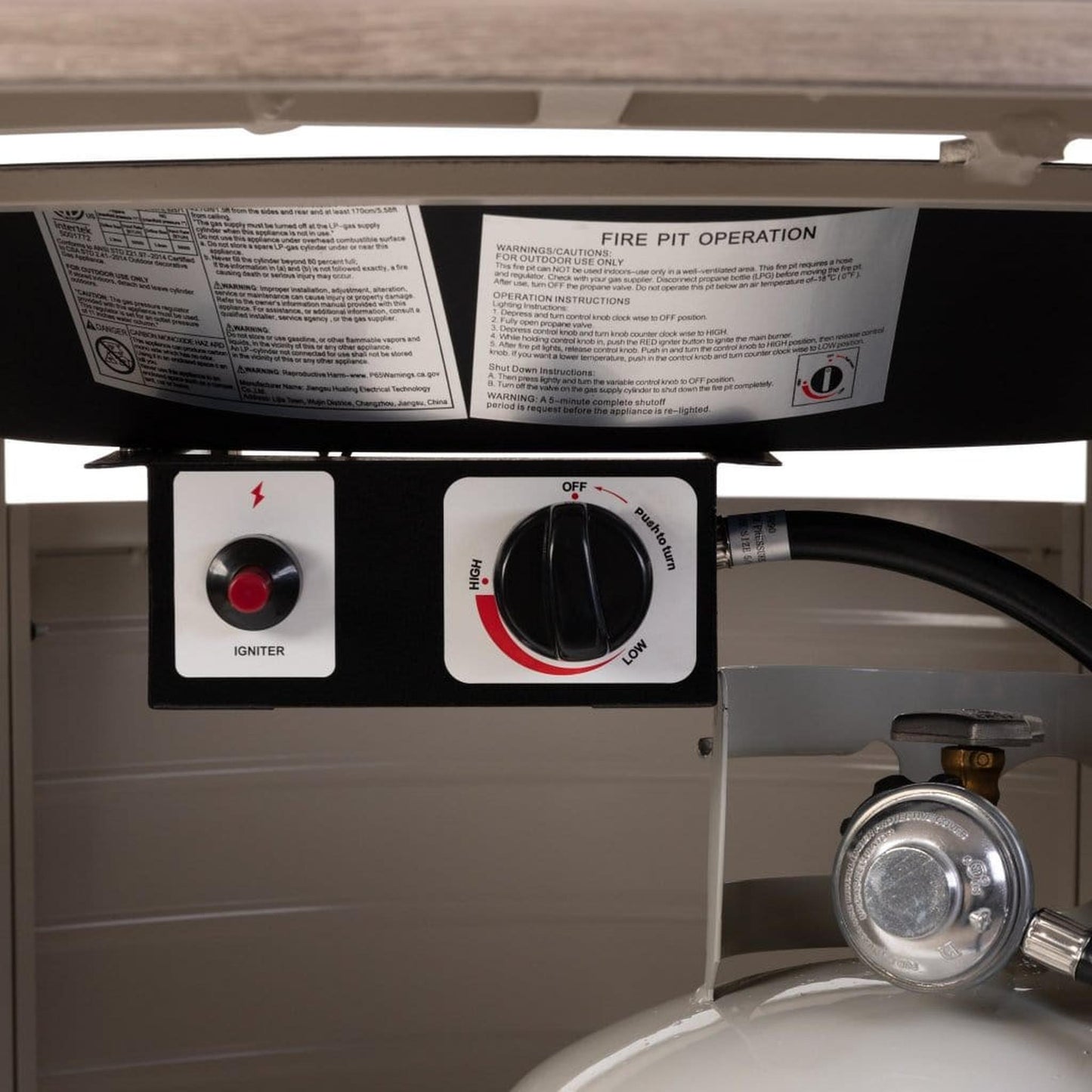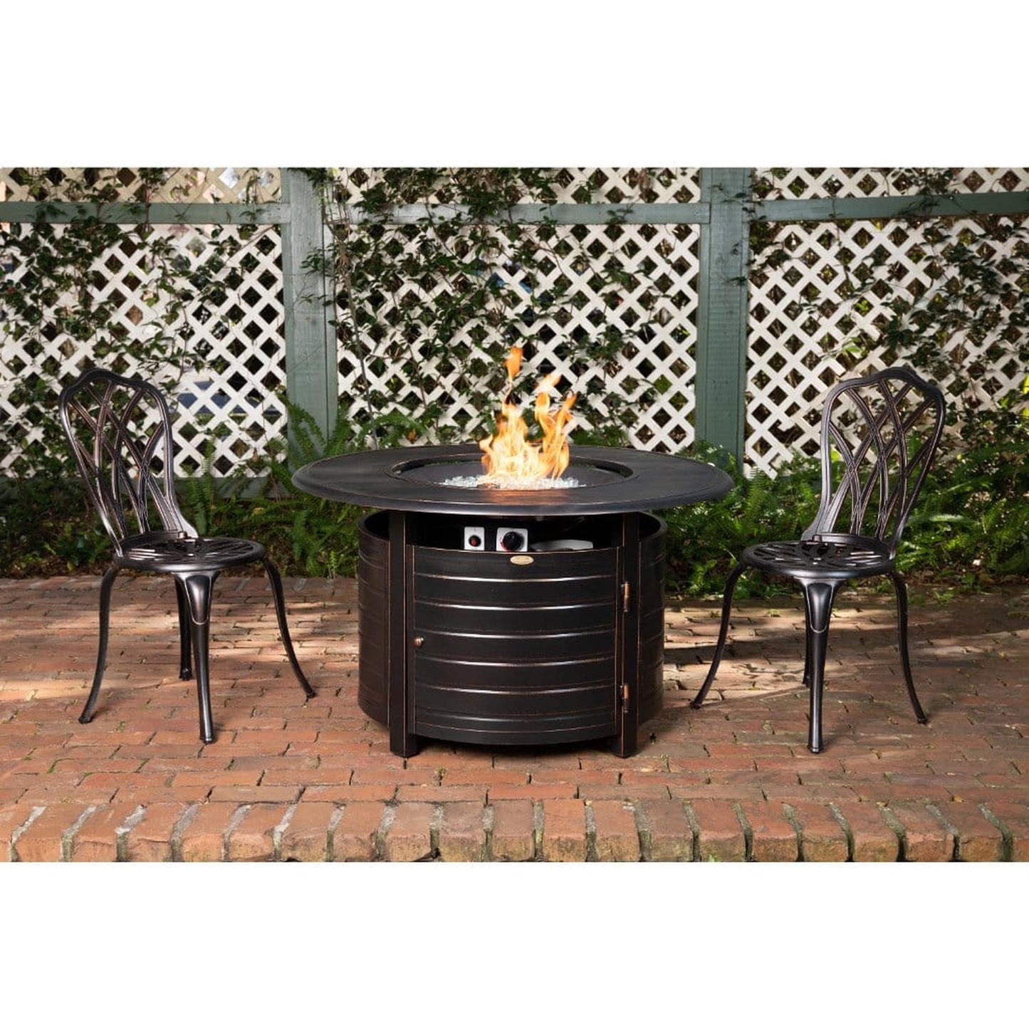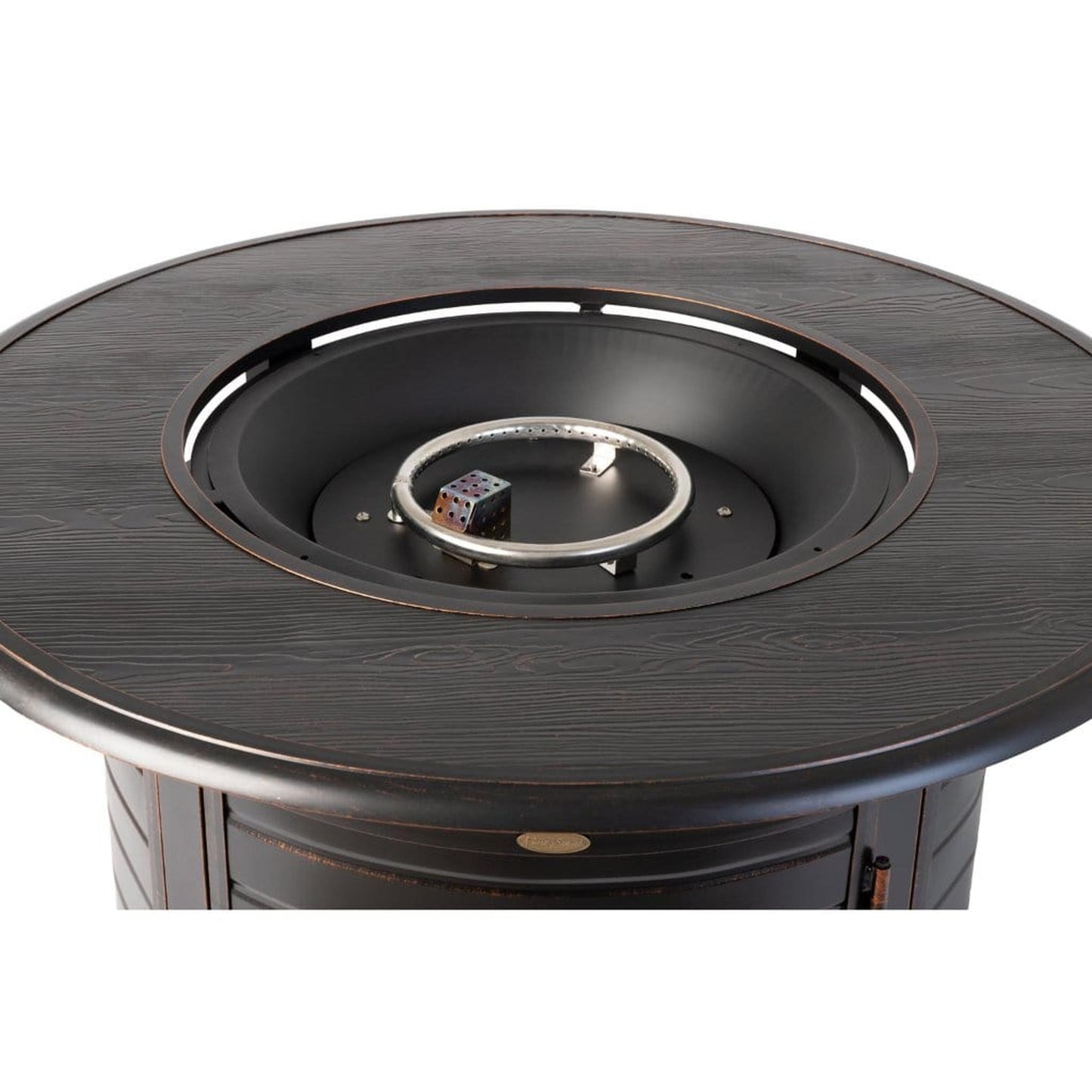 The Thatcher Round Gas Fire Pit boasts a three-dimensional woodgrain motif in an antique bronze or driftwood or barnwood finish that will be right at home in your outdoor space. With a practical aluminum build and an output of 50,000 BTU, this versatile fire pit pulls double duty in warmer weather as a patio table when covered with the included fire bowl lid. Arriving with clear fire glass for a stylish touch, just add a standard 20 lb propane tank behind the handy hinged door. A nylon cover for the fire pit is included for your convenience.