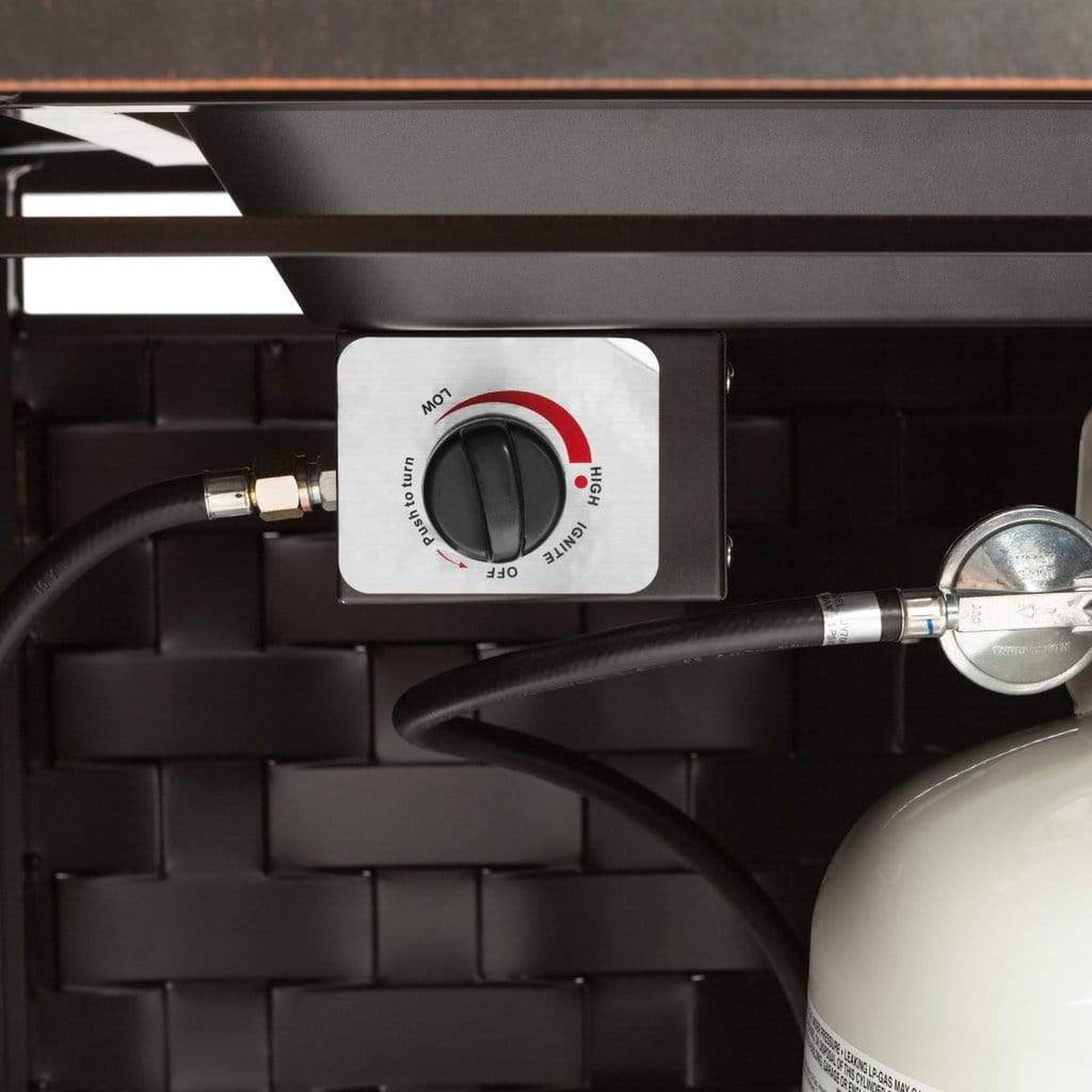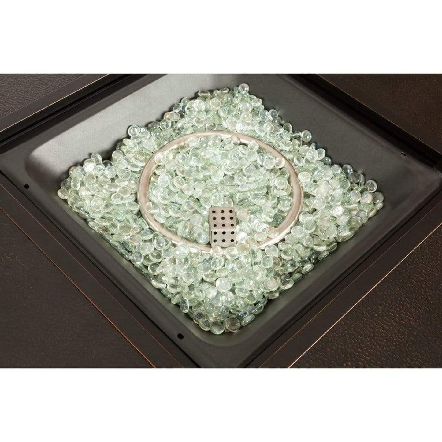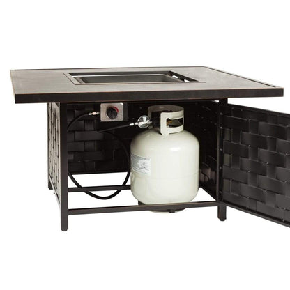 Compatible with any contemporary or traditional outdoor décor, the Armstrong Square Aluminum LPG Fire Pit features an oversized splitwood-style basketweave motif complemented by a subtly-pebbled table surface. With an Antique Bronze brushed finish, practical aluminum build, and an output of 50,000 BTU, this versatile fire pit pulls double duty as a patio table when you add the included fire bowl lid with flush-mounted handle. Arriving with clear fire glass for a stylish touch, just add a standard 20 lb propane tank behind the convenient hinged door. A nylon cover for the fire pit is included for your convenience.