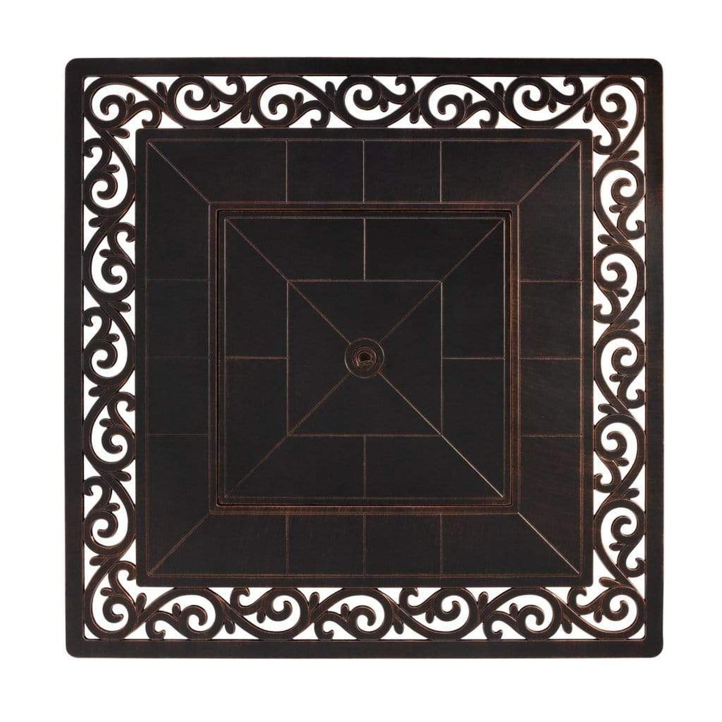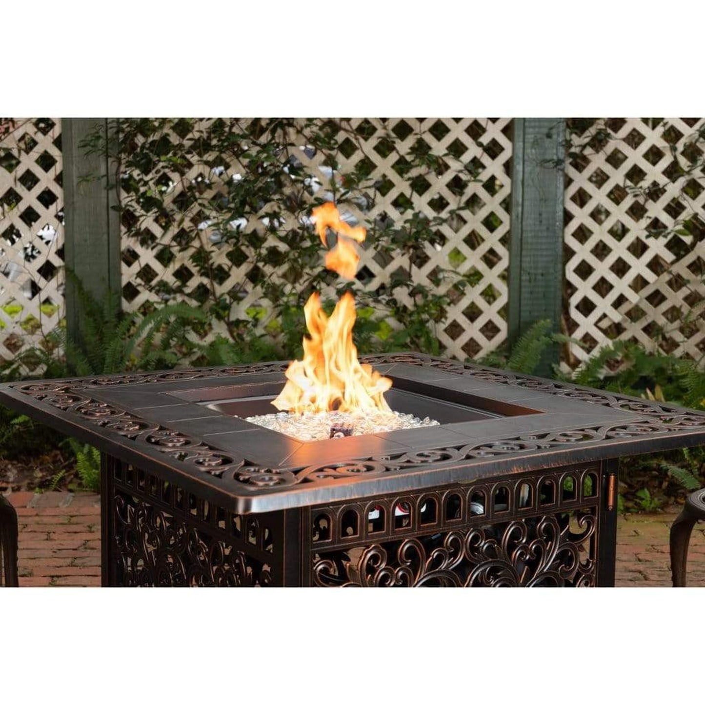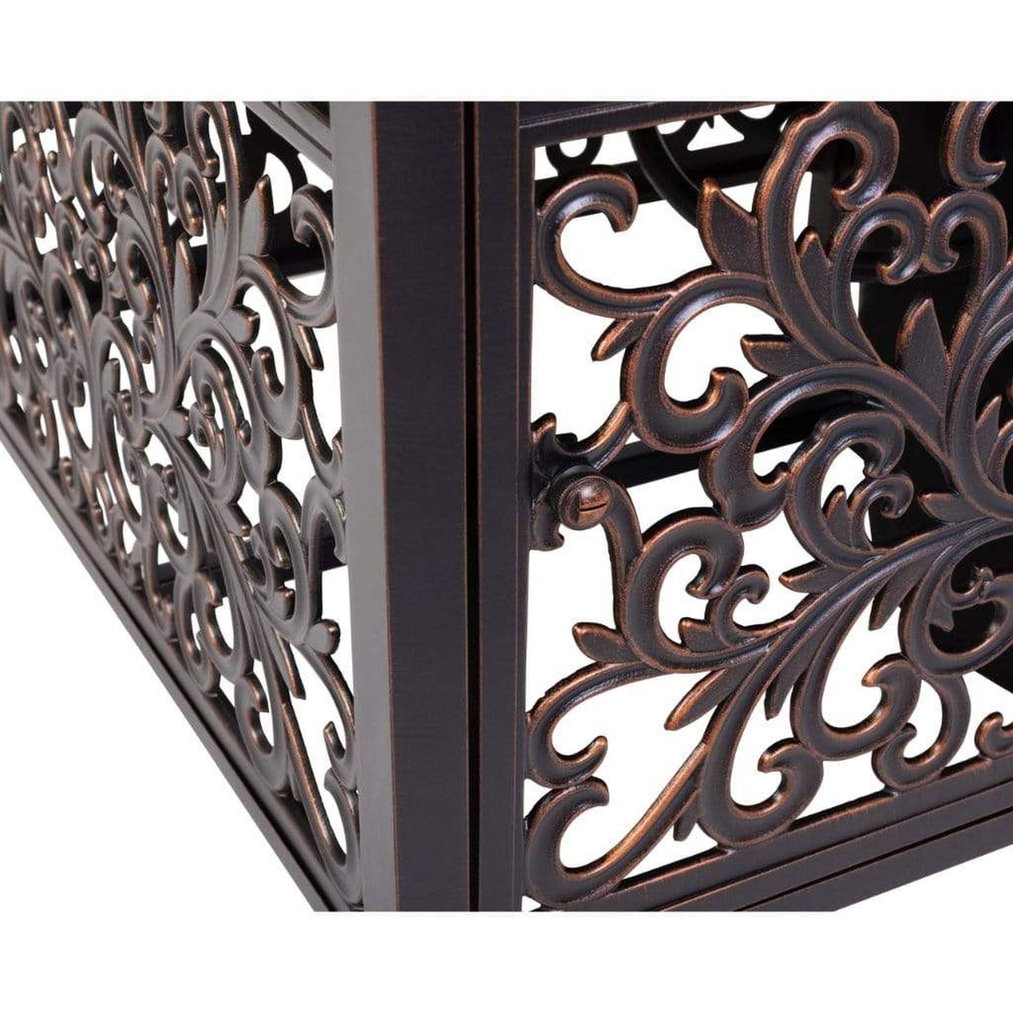 Compatible with any contemporary or traditional outdoor decor, the Sedona Square Aluminum LPG Fire Pit features a cast-iron-style scrollwork motif complemented by a Antique Bronze finish. With a practical aluminum build and an output of 50,000 BTU, this versatile fire pit pulls double duty as a patio table – just add the included fire bowl lid with handle. Arriving with clear fire glass for a stylish touch, add a standard 20 lb propane tank behind the convenient hinged door. A nylon cover for the fire pit is included for your convenience.