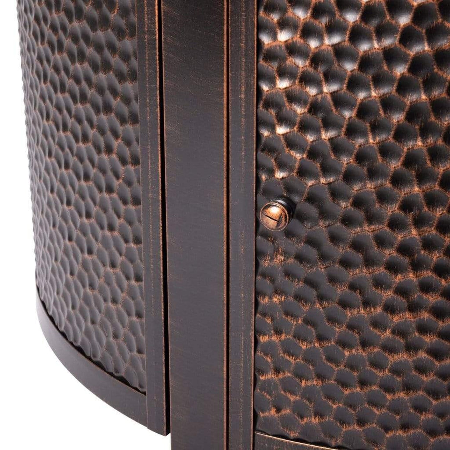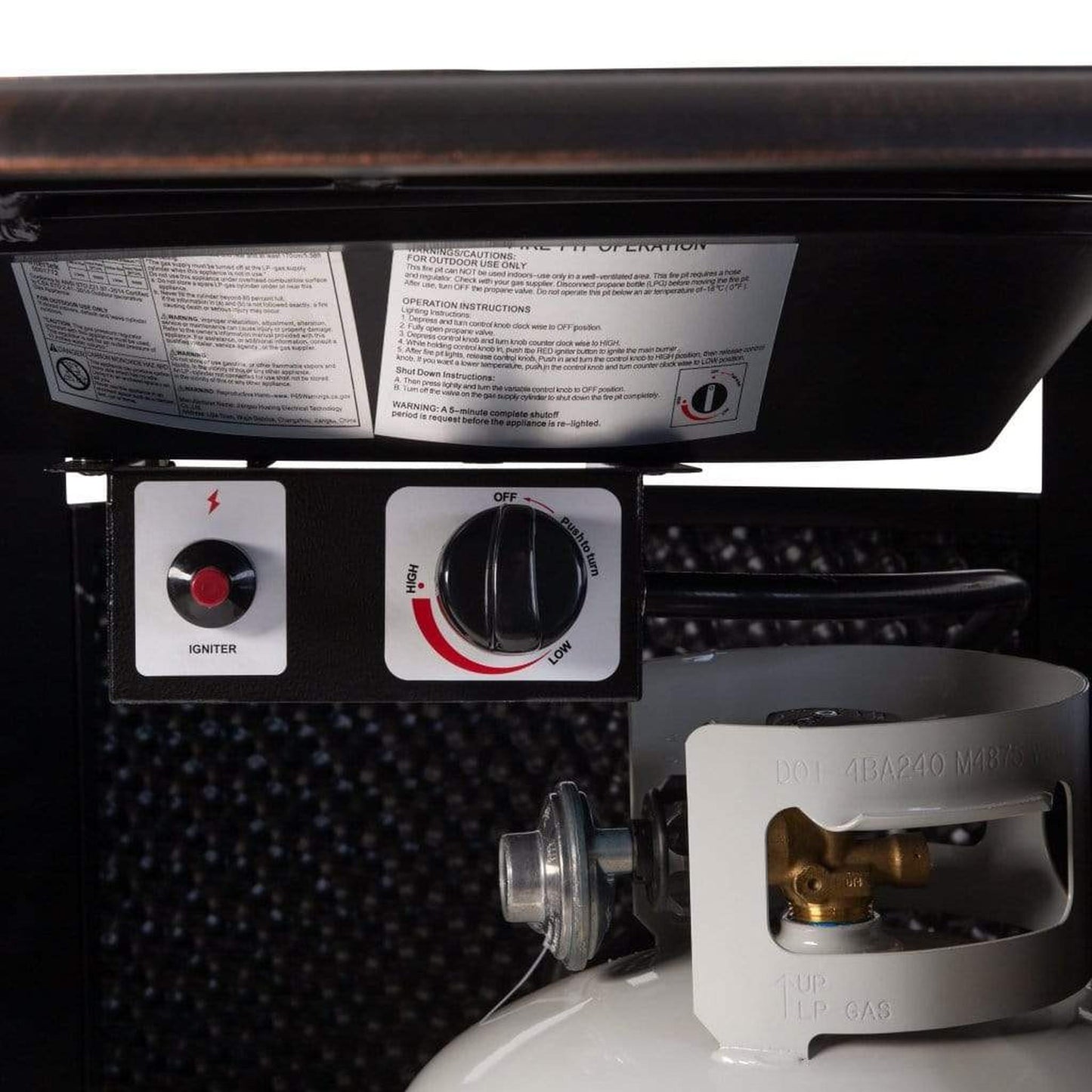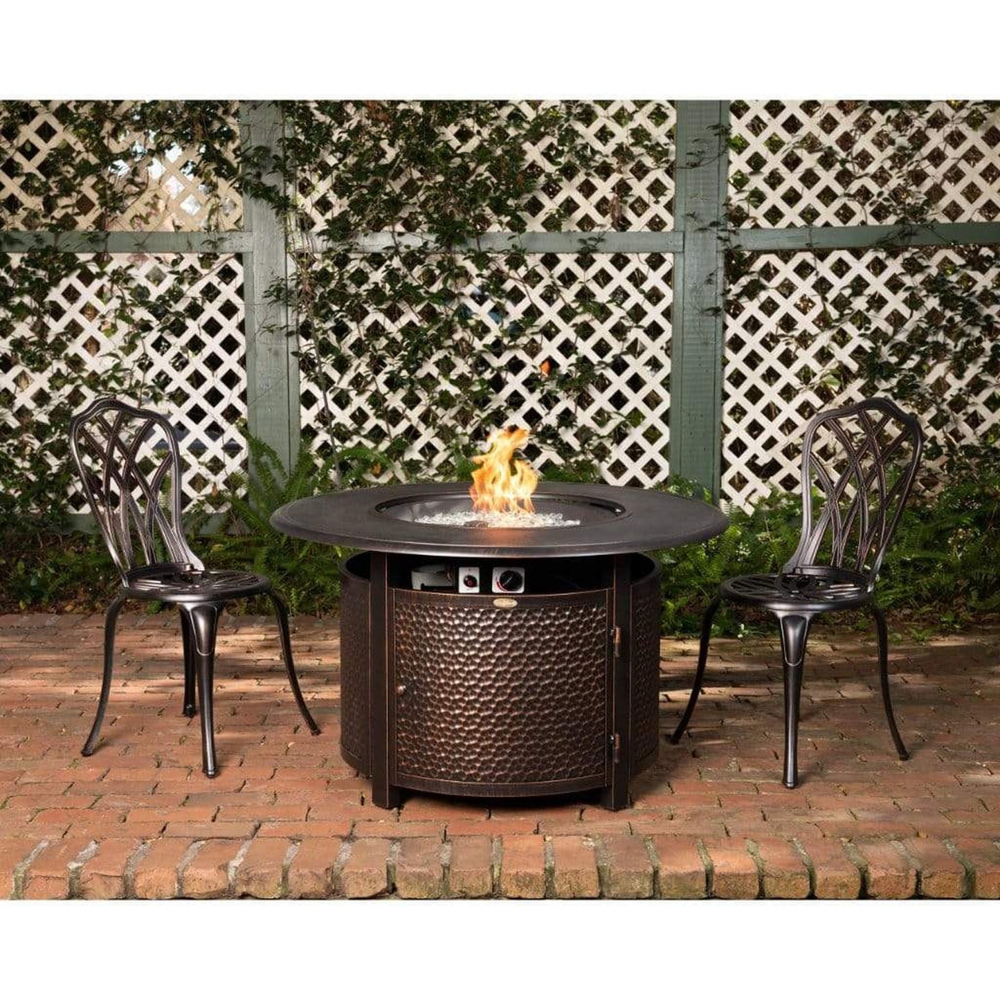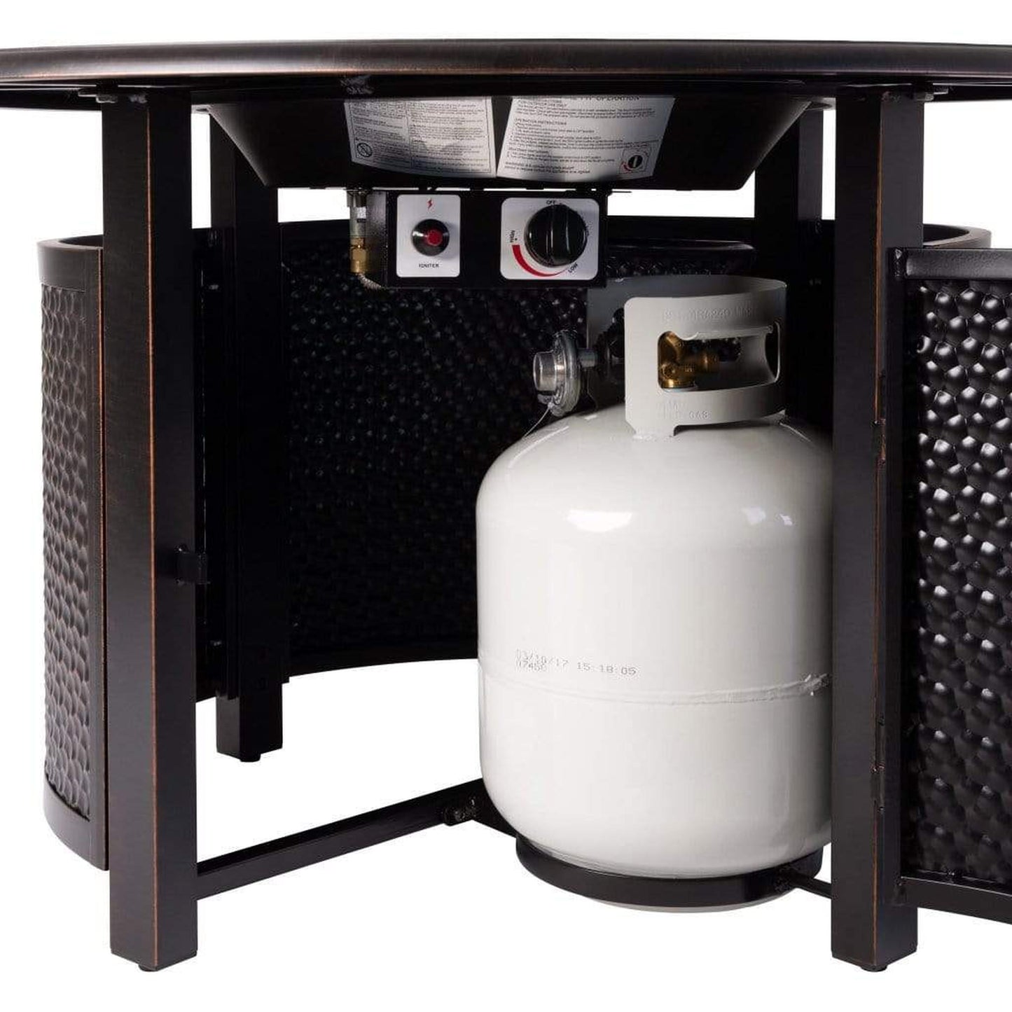 The Weyland Round Gas Fire Pit boasts a hammered metal motif in an antique bronze finish that will be right at home in your outdoor space. With a practical aluminum build and an output of 50,000 BTU, this versatile fire pit pulls double duty in warmer weather as a patio table when covered with the included fire bowl lid. Arriving with clear fire glass for a stylish touch, just add a standard 20lb propane tank behind the handy hinged door. A nylon cover for the fire pit is included for your convenience.