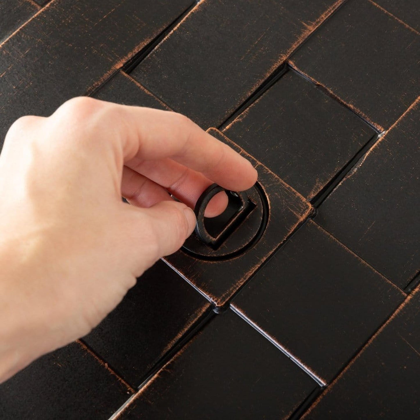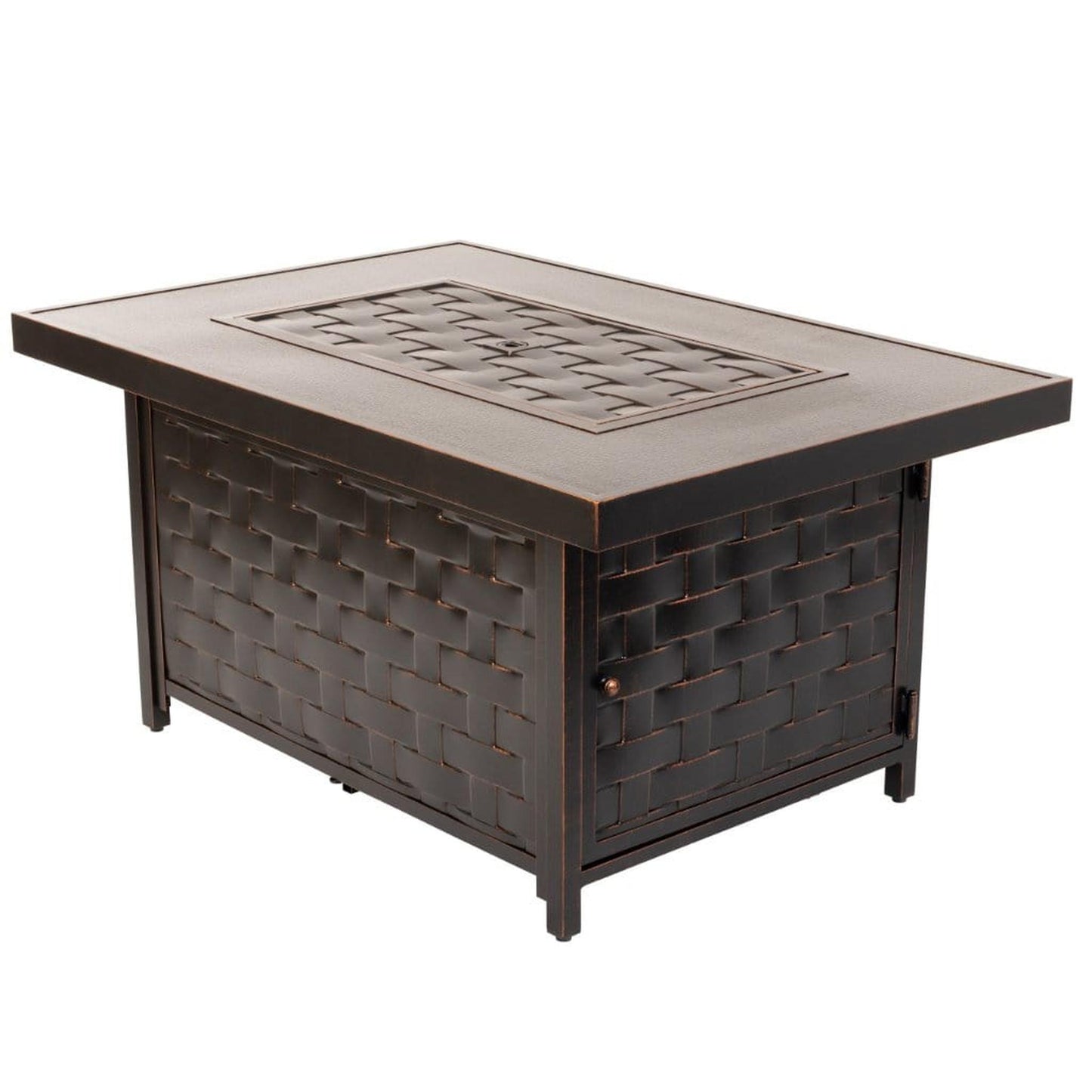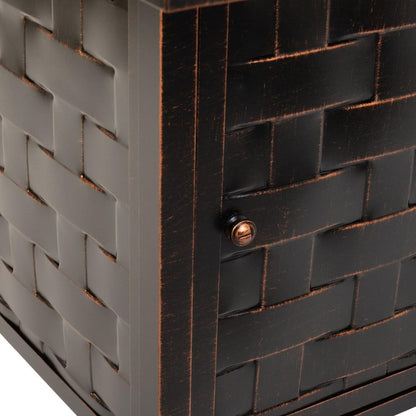 Compatible with any contemporary or traditional outdoor decor, the Armstrong Rectangular Aluminum LPG Fire Pit features an oversized splitwood-style basketweave motif complemented by a subtly-pebbled table surface. With an Antique Bronze brushed finish, practical aluminum build, and an output of 50,000 BTU, this versatile fire pit pulls double duty as a patio table when you add the included fire bowl lid with flush-mounted handle. Arriving with clear fire glass for a stylish touch, just add a standard 20lb propane tank behind the convenient hinged door. A nylon cover for the fire pit is included for your convenience.