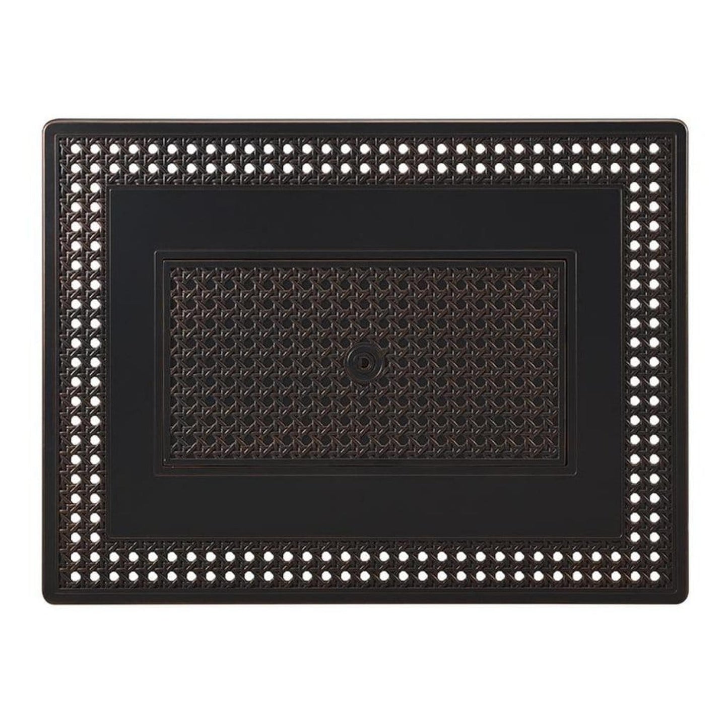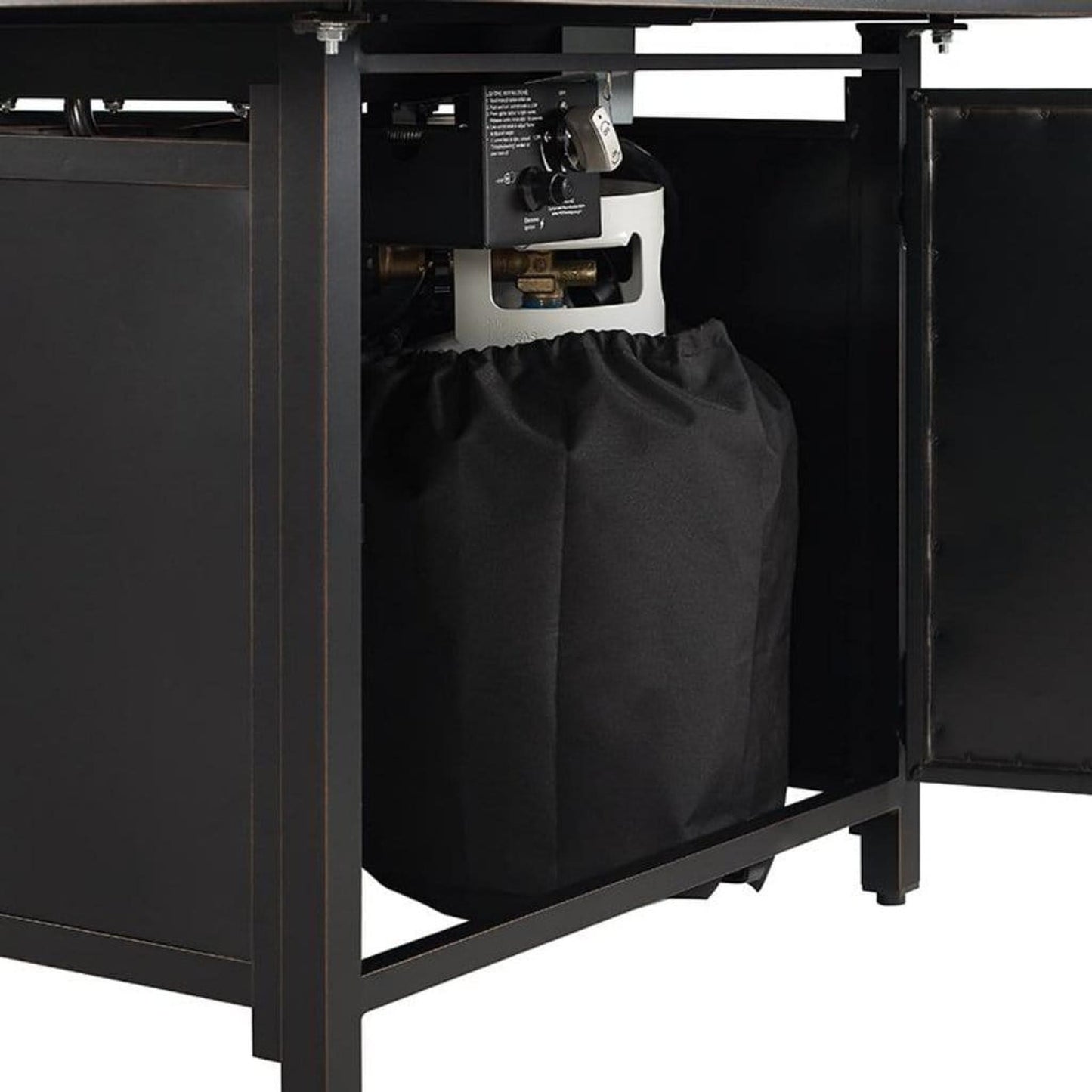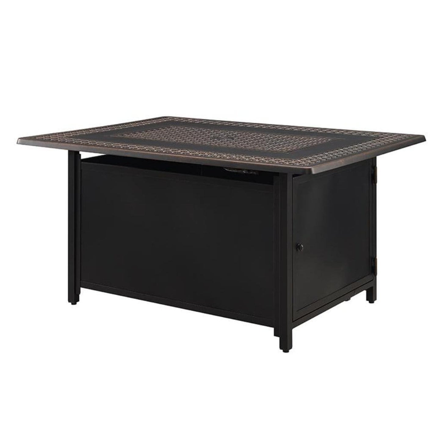 The Perkins Rectangular Aluminum Gas Fire Pit shows off an elegant cane-weave tabletop and burnished antique bronze finish compatible with traditional or contemporary outdoor décor. With a practical aluminum build and an adjustable full-flame output of 55,000 BTU, this versatile and compact fire pit pulls double duty as a patio table when covered with the included fire bowl lid. Arriving with clear fire glass droplets for a stylish touch, just add a standard 20lb propane tank behind the handy hinged door. A nylon cover for the fire pit is included for your convenience.