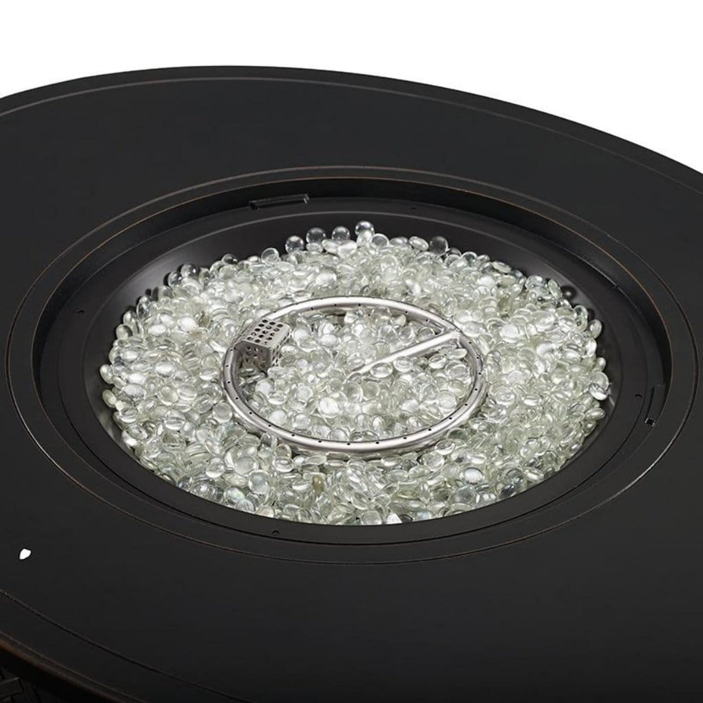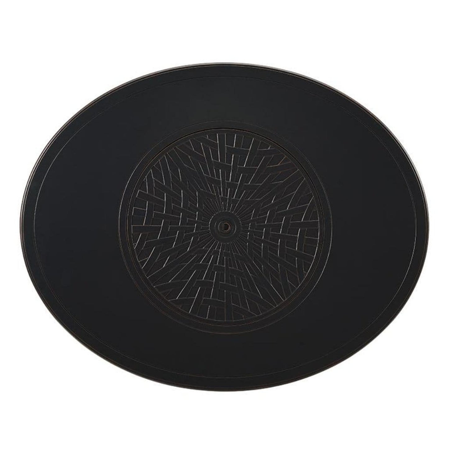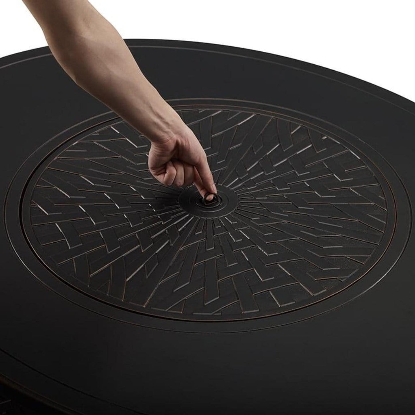 The Taylor Oval Aluminum Gas Fire Pit shows off a lattice weave pattern and burnished antique bronze finish compatible with classic and contemporary outdoor décor. With a practical aluminum build and an adjustable full-flame output of 55,000 BTU, this versatile and compact fire pit pulls double duty as a patio table when covered with the included fire bowl lid. Arriving with clear fire glass droplets for a stylish touch, just add a standard 20lb propane tank behind the handy hinged door. A nylon cover for the fire pit is included for your convenience.