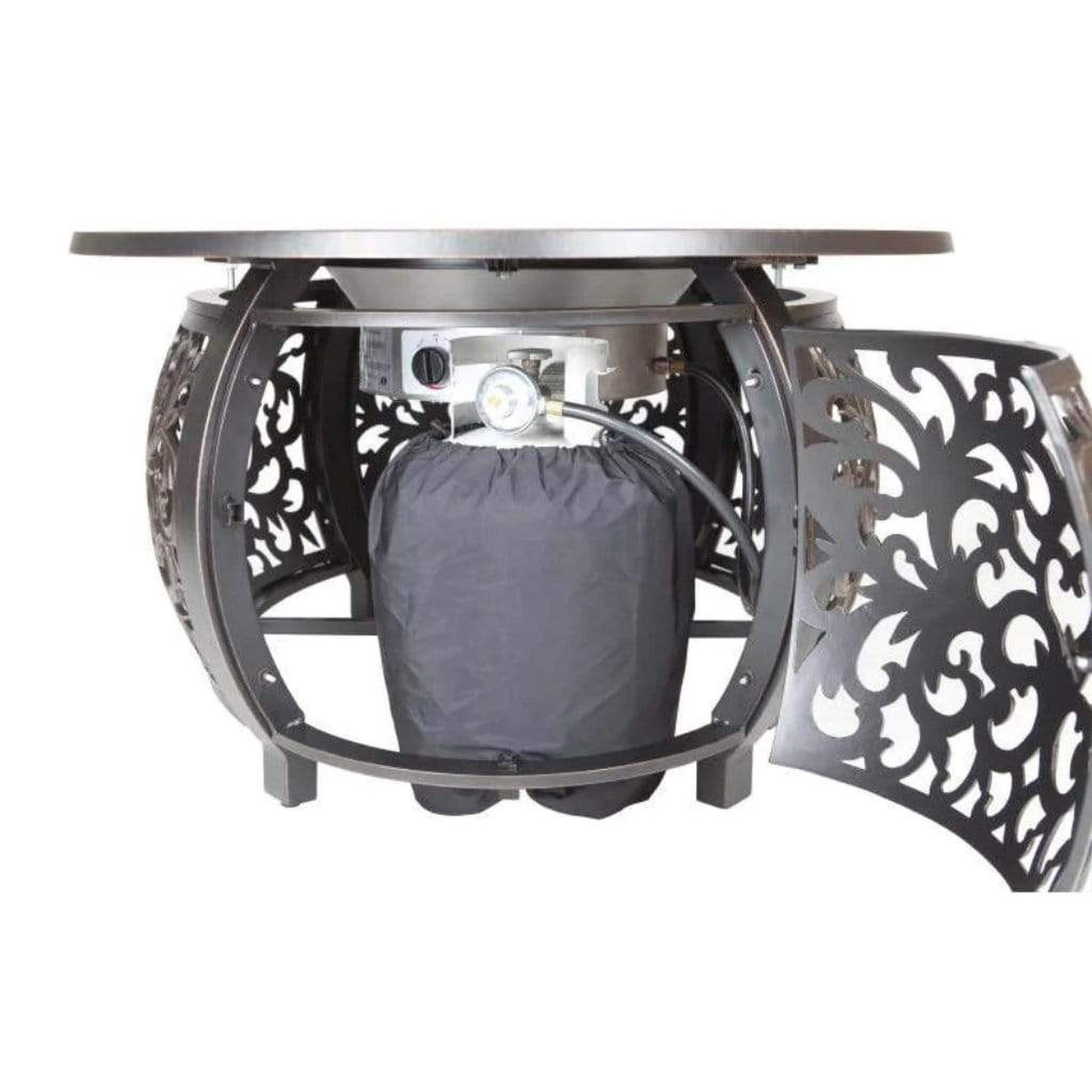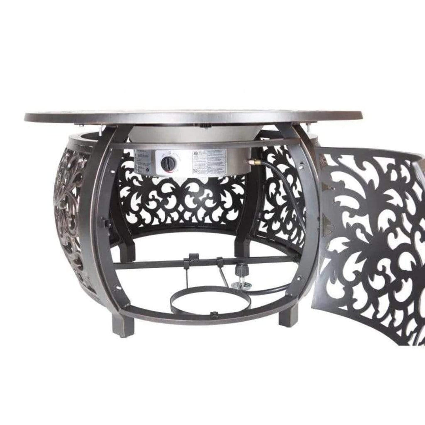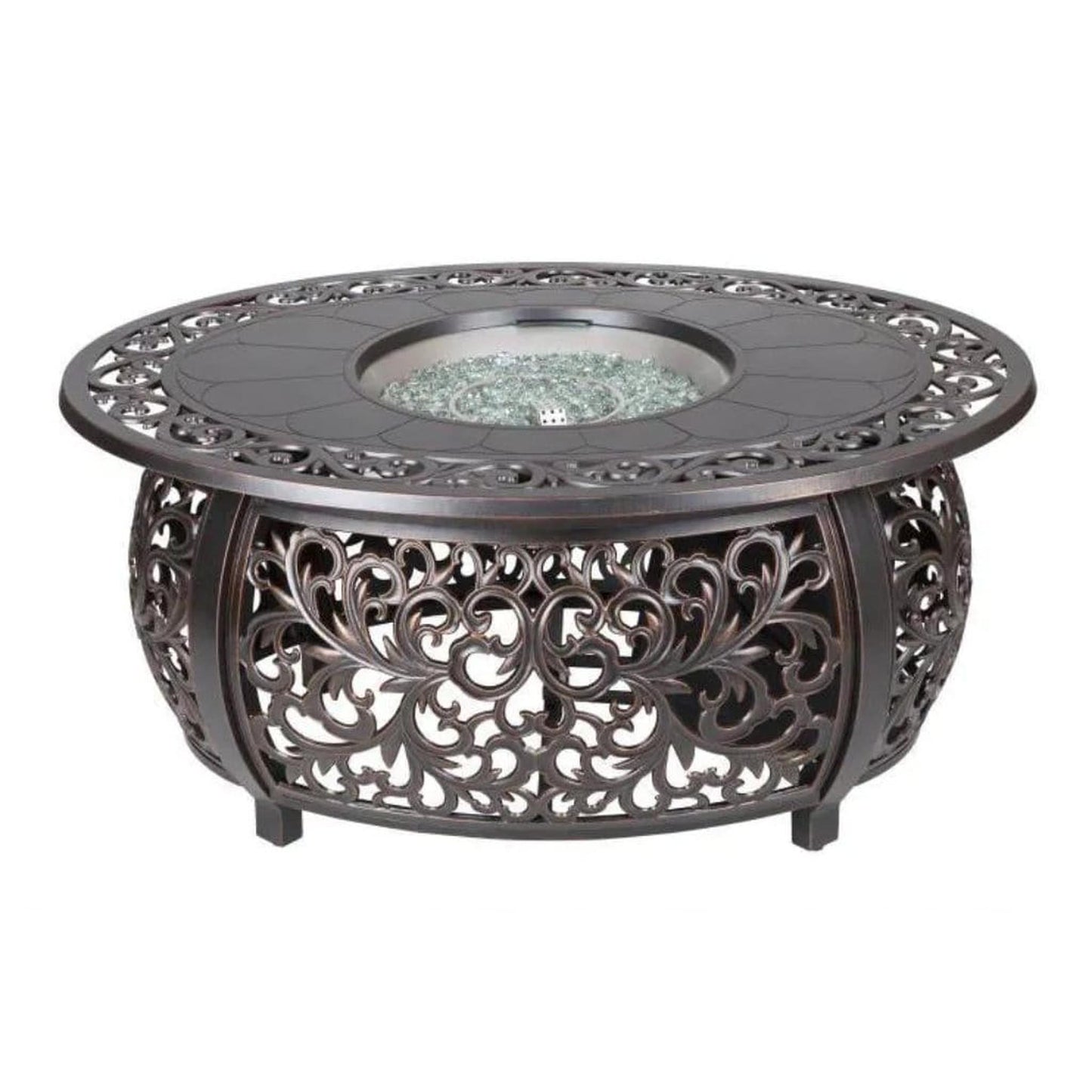 The multi-functional Toulon Aluminum Oval LPG Fire Pit is a 50,000 BTU-unit operating on a standard 20 lb. propane tank which sits safely beneath the unit, accessible through a hinged door. This Toulon Aluminum Oval LPG Fire Pit functions not only as a fire pit, but also as an outdoor patio table thanks to its convenient cast-aluminum fire bowl lid.  This unit produces a beautiful fully adjustable flame. Comes complete with clear fire glass (18 lbs.), and covers for fire pit and propane tank.