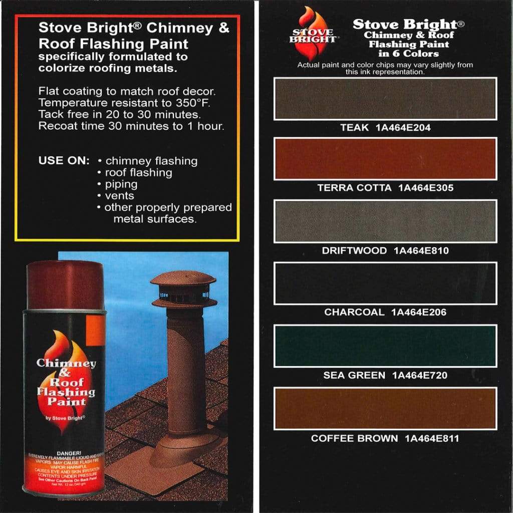 Stove Bright® Chimney & Roof Flashing Paint has been used by chimney sweeps and other hearth professionals to paint exterior exposed stove pipe above the roofline for many years.  The 6 colors match the 6 most popular roofing material colors, which allows the coating to hide the stove pipe stack in the profile of the roofline.