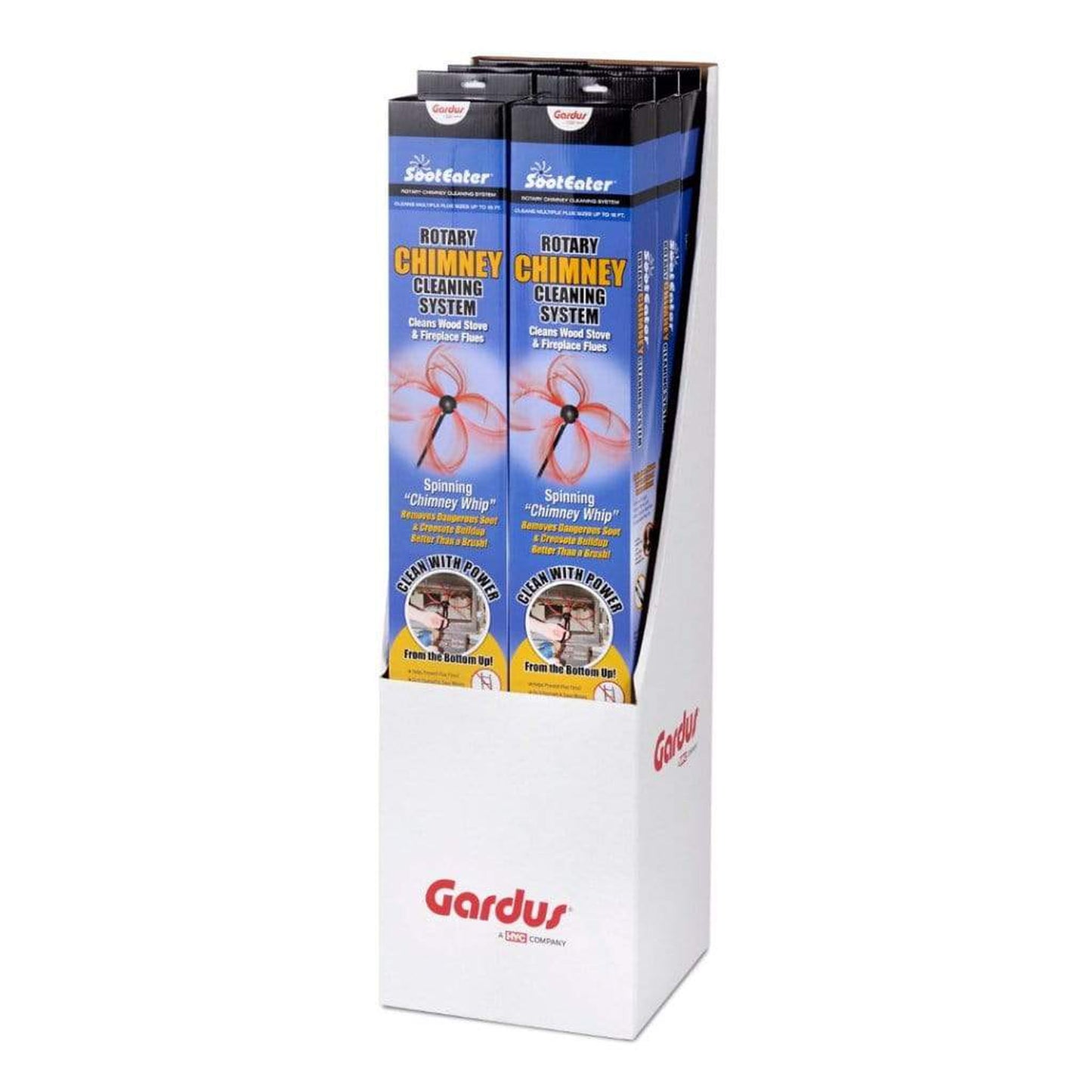 The SootEater Rotary Chimney Cleaning System safely cleans your chimney with ease from the ground up! Increase the performance of your wood stove or fireplace while decreasing your risk of fire. The SootEater chimney whip and flexible button-link quick connect extension rods easily remove dangerous soot and creosote build-up in your chimney when powered by your cordless drill (not included). Easy to use, the powerful rotating forward and reverse action of the chimney whip and flexible rods scours your chimney wall, effectively cleaning chimneys up to 18’ in length. Our unique chimney whip design cleans multiple flue shapes and sizes. Rods are constructed of 16mm polypropylene and are flexible enough to make over 90o bends. The SootEater works better than a wire brush, won’t scratch metal flues, and fits through tight areas; optional accessories include replacement whip line and extension rods. Help prevent flue fires and save money while doing so. It’s easy when cleaning with Gardus power!