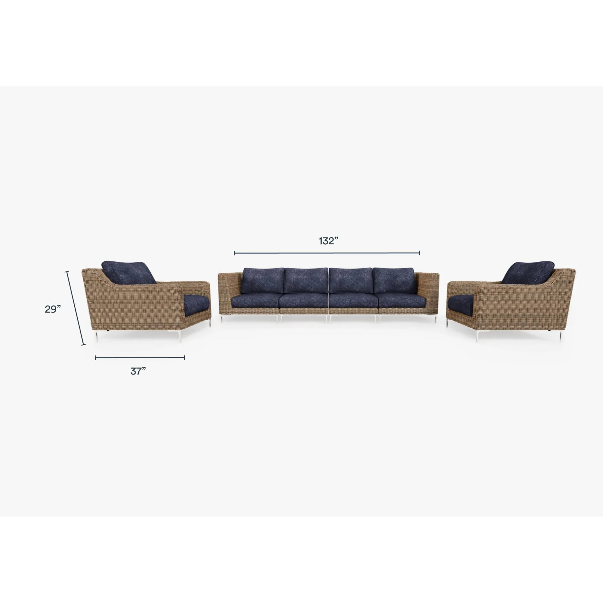 Live Outer 132" Brown Wicker Outdoor Sofa With Armchairs & Deep Sea Navy Cushion (6-Seat)