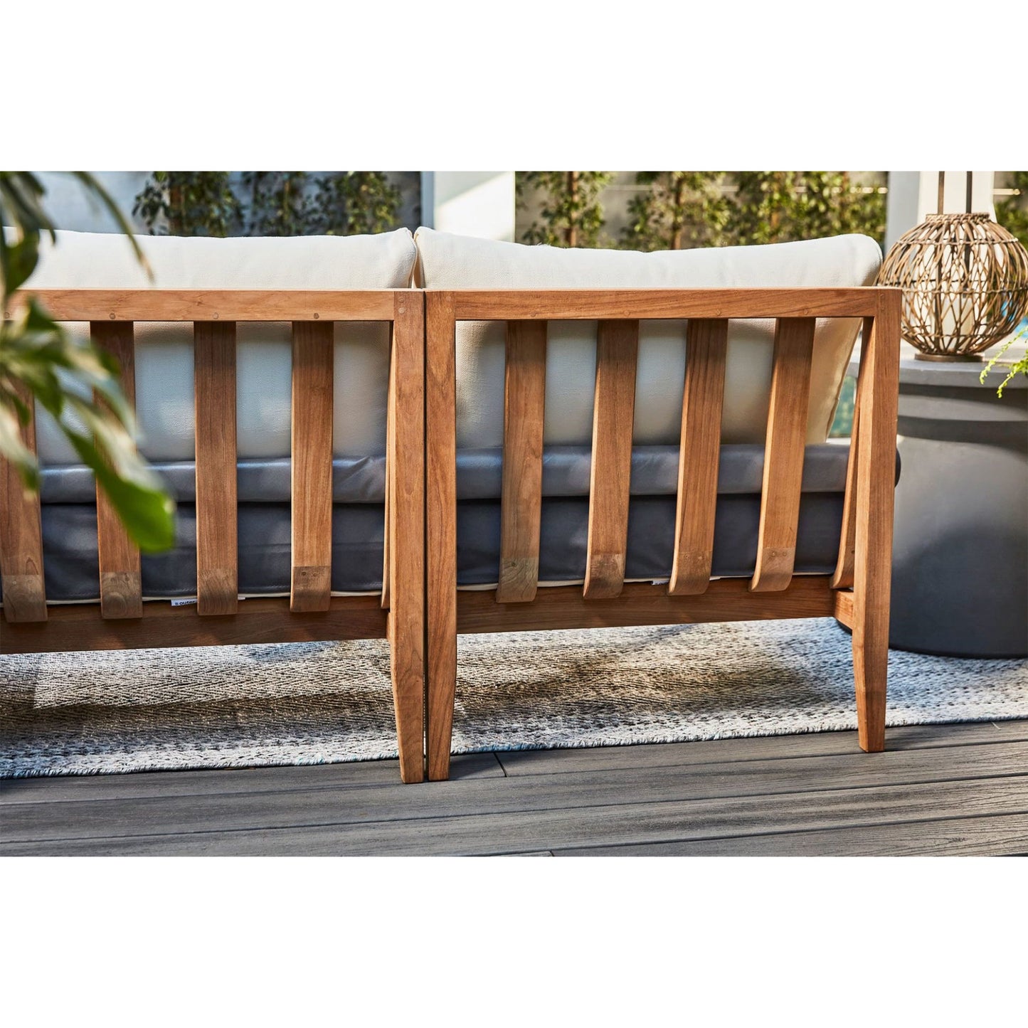 Enjoy indoor comfort outside. Timeless and crafted from naturally durable FSC® certified teak hardwood, Outer’s modular patio furniture invites you to relax on luxuriously comfortable memory foam cushions. The built-in, easy to use OuterShell® cover protects the cushions when not in use, and features Velcro to secure it in place and a handle for convenient transport and storage. No assembly required. Includes 2 armless chairs.