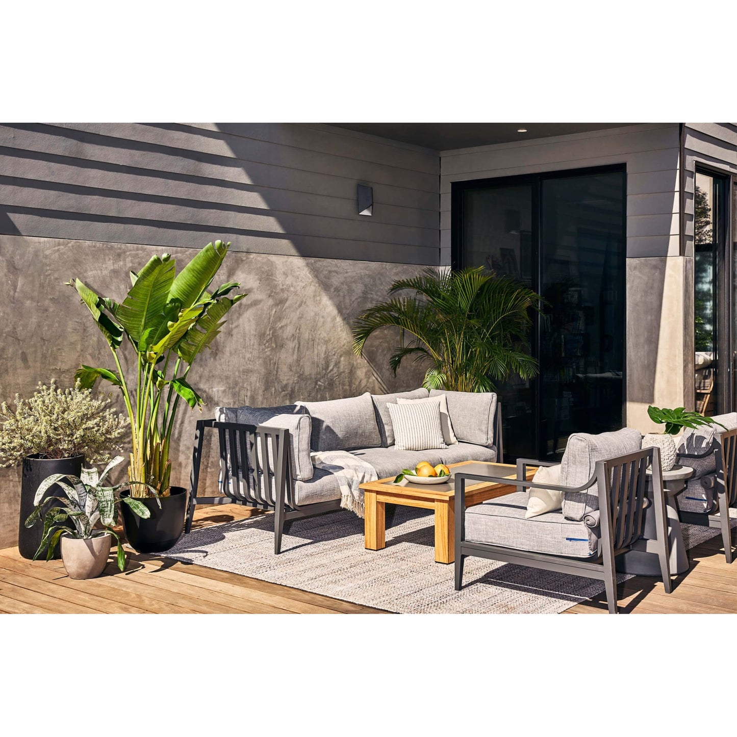Enjoy indoor comfort outside. Sleek, lightweight, and durably designed with weatherproof aluminum, Outer’s modular furniture invites you to relax on luxuriously comfortable memory foam cushions. The built-in, easy to use OuterShell® cover protects the cushions when not in use, and features Velcro to secure it in place and a handle for convenient transport and storage. No assembly required.