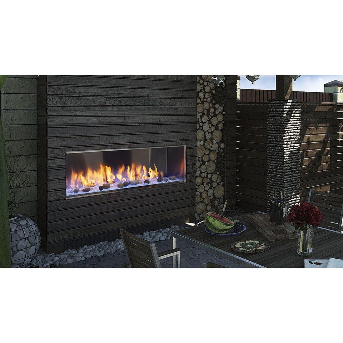 Upgrade your evenings with the Lanai Double-Sided outdoor fireplace. Its linear design showcases dynamic, end-to-end ribbon flames and colorful crushed glass from multiple angles, while rust-resistant 304 stainless steel beautifully weathers any climate for long-lasting enjoyment. Available in 48-inch width.