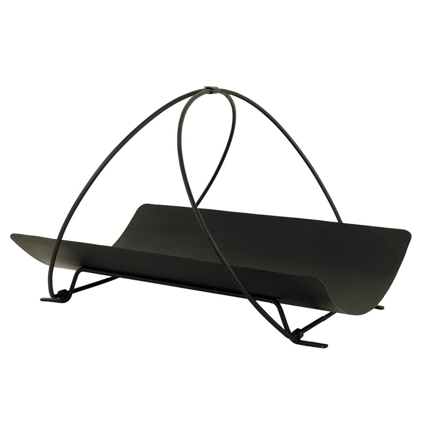 This simple and handy log basket takes its inspiration from the traditional European bread baskets. We have substituted the open wickerwork with a solid steel sheet to prevent wood bark and shavings from falling on the hearth. Handles fold down for easy shipping and storage when not in use.
