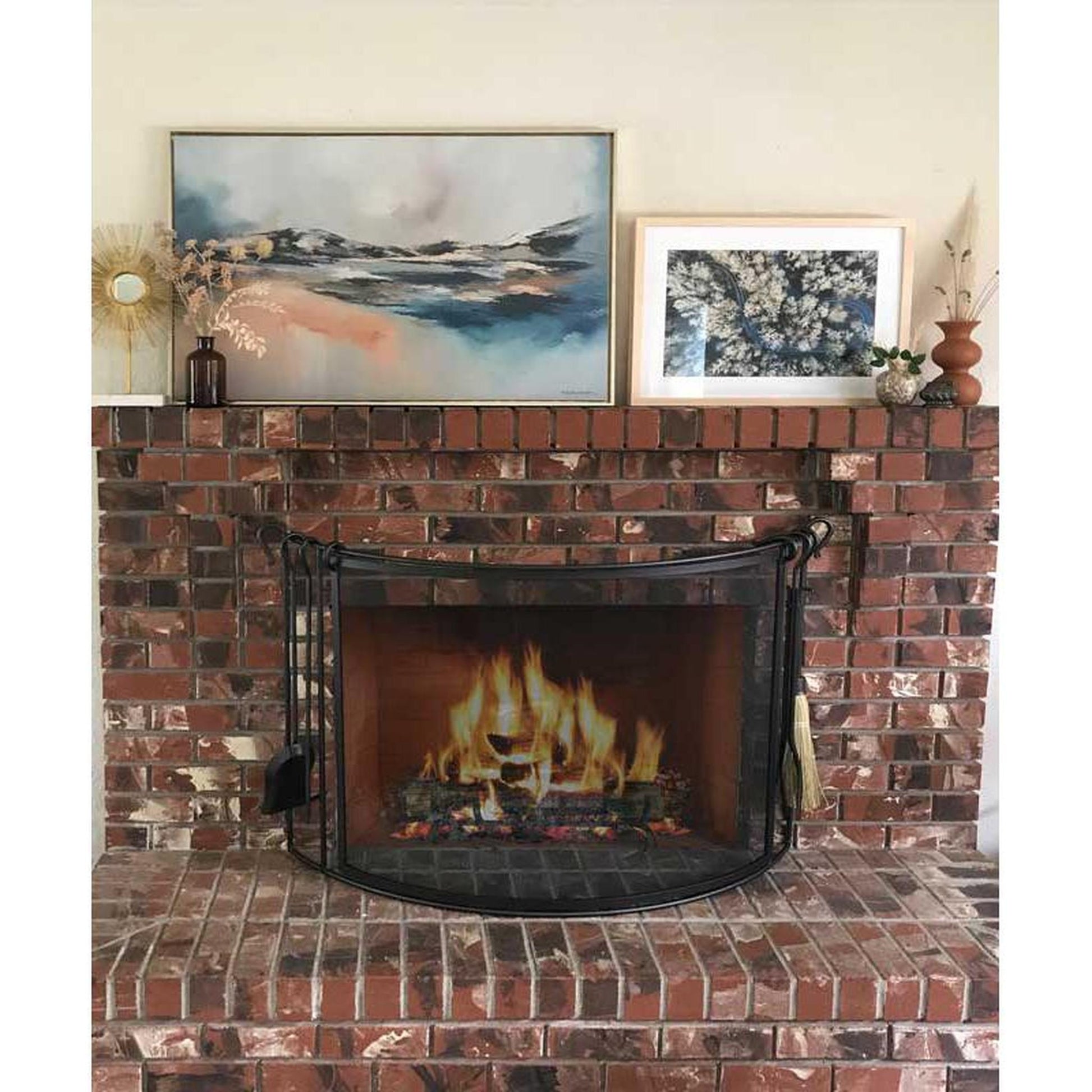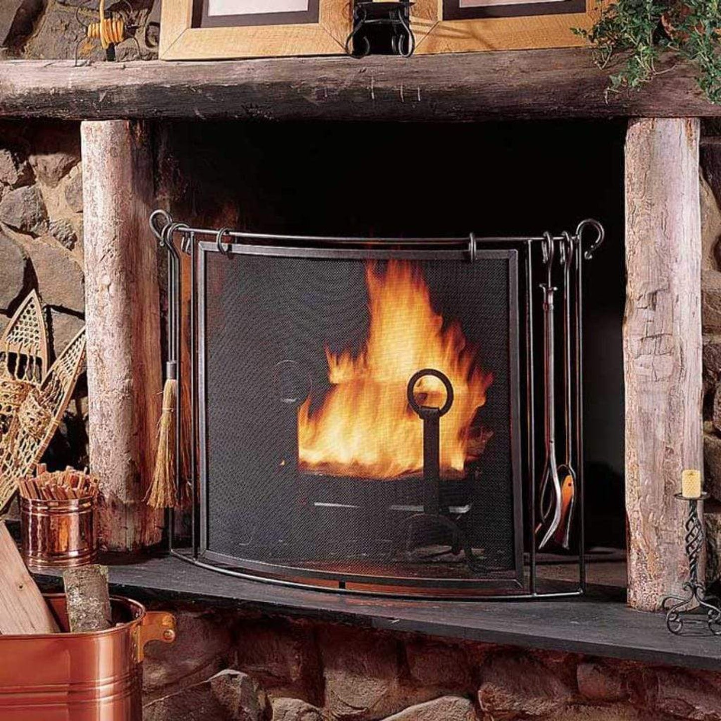 A Pilgrim classic, our beautiful bowed screen with hand-forged and twisted details on the screen and match-forged details on each tool. Simply stylish and sturdy, four fireplace tools, including a corn broom, poker, shovel, and tongs, hang freely across the top of this handsome screen. Finished in vintage iron, this screen will be admired for generations. 6 1/2 depth.