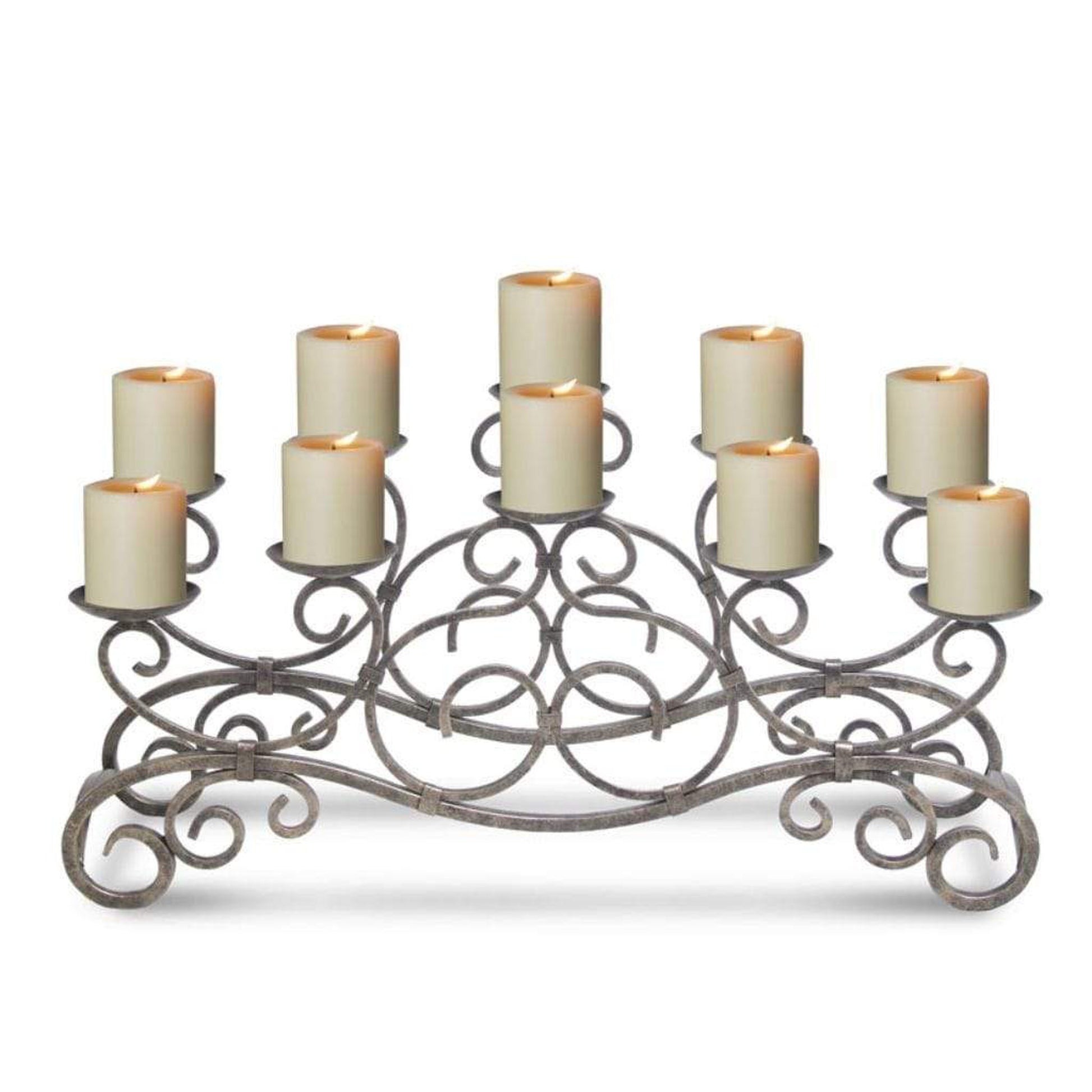 This beautiful candelabra will add warmth to your fireplace or be the centerpiece of your tabletop. Use as a fireplace accent or centerpiece. Cupped holders are designed to capture any wax spills. Holds 10–3″ dia. pillar candles.