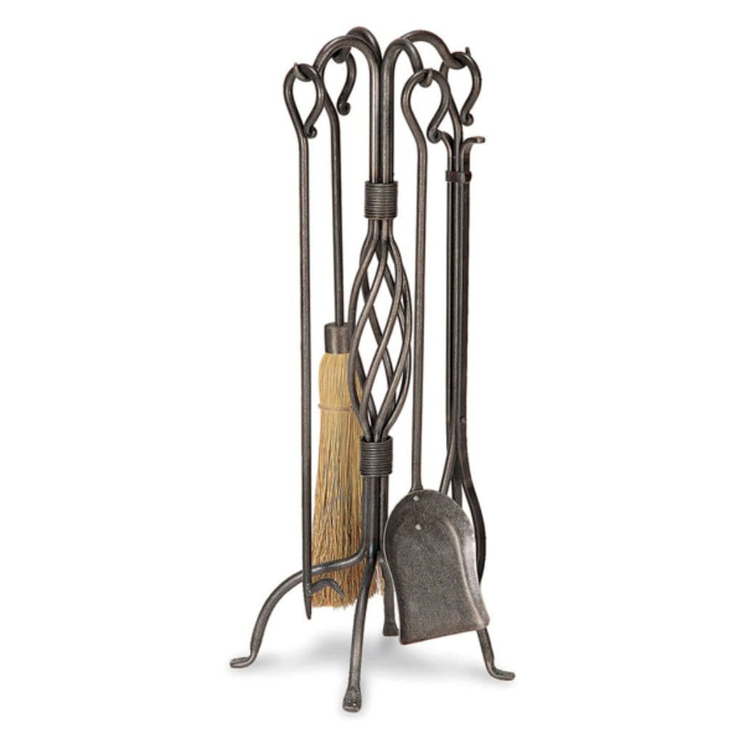Bring the past into the present with our Center Basket Weave fireplace tool set. Artistry and craftsmanship are exemplified by intertwined hand-forged iron work. An American classic, this set is finished in vintage iron and is scaled to fit most fireplace hearths. This Pilgrim fireplace tool set stands at 31” H and weighs 19 pounds of solid forged iron you will be proud to own.