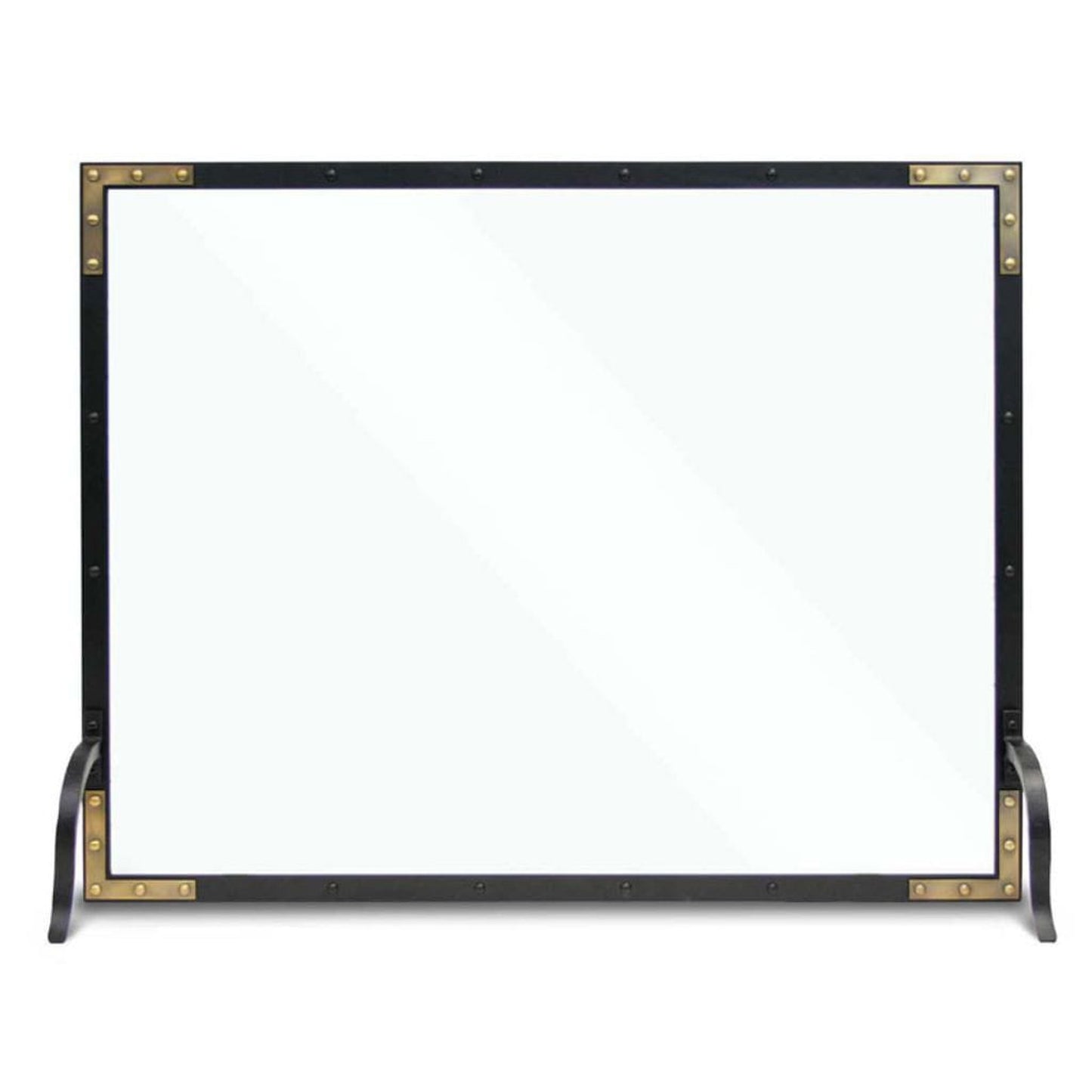 Riveted corner brackets in burnished brass lend this fire screen refined industrial style. The single-panel screen stands on graceful curved feet.