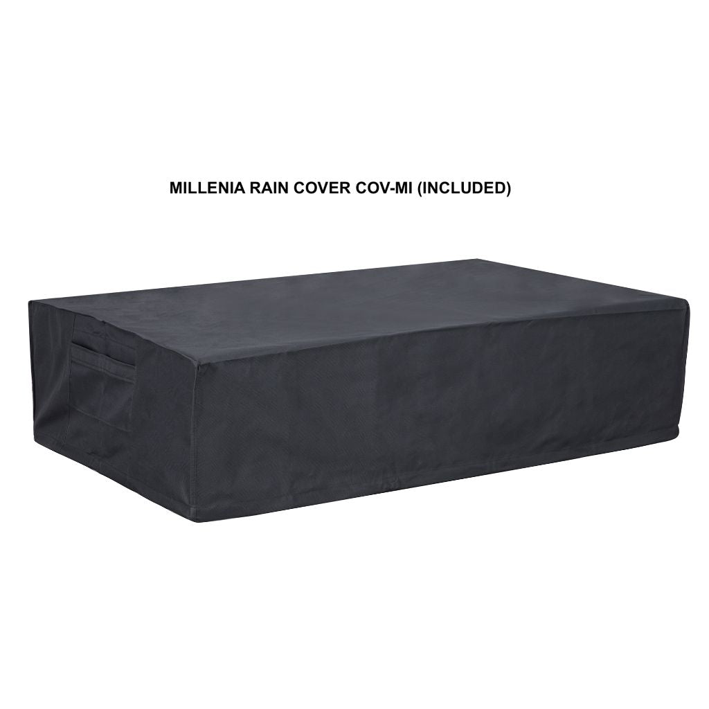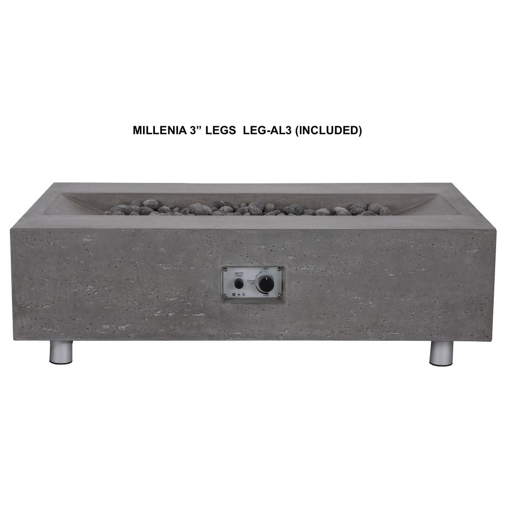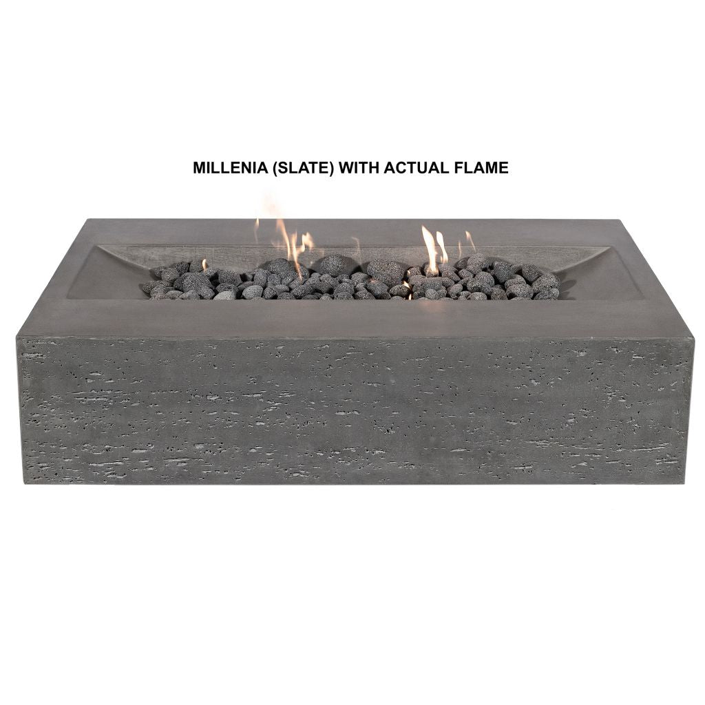 Millenia is hand cast from high-performance Glass Fiber Reinforced Concrete (GFRC) with 2 coats of clear sealer applied. GFRC is lighter compared to materials like marble and stone but provides the same level of durability while giving a natural handcrafted look. On the other hand, due to the glass fibers mixed in the GFRC help to reinforce the concrete, it's stronger than MGO (Magnesium Oxide) and without paint in GFRC makes it more colorfast to withstand the outdoor elements. The trough burner design of Millenia fire table creates a desirable curtain flame.