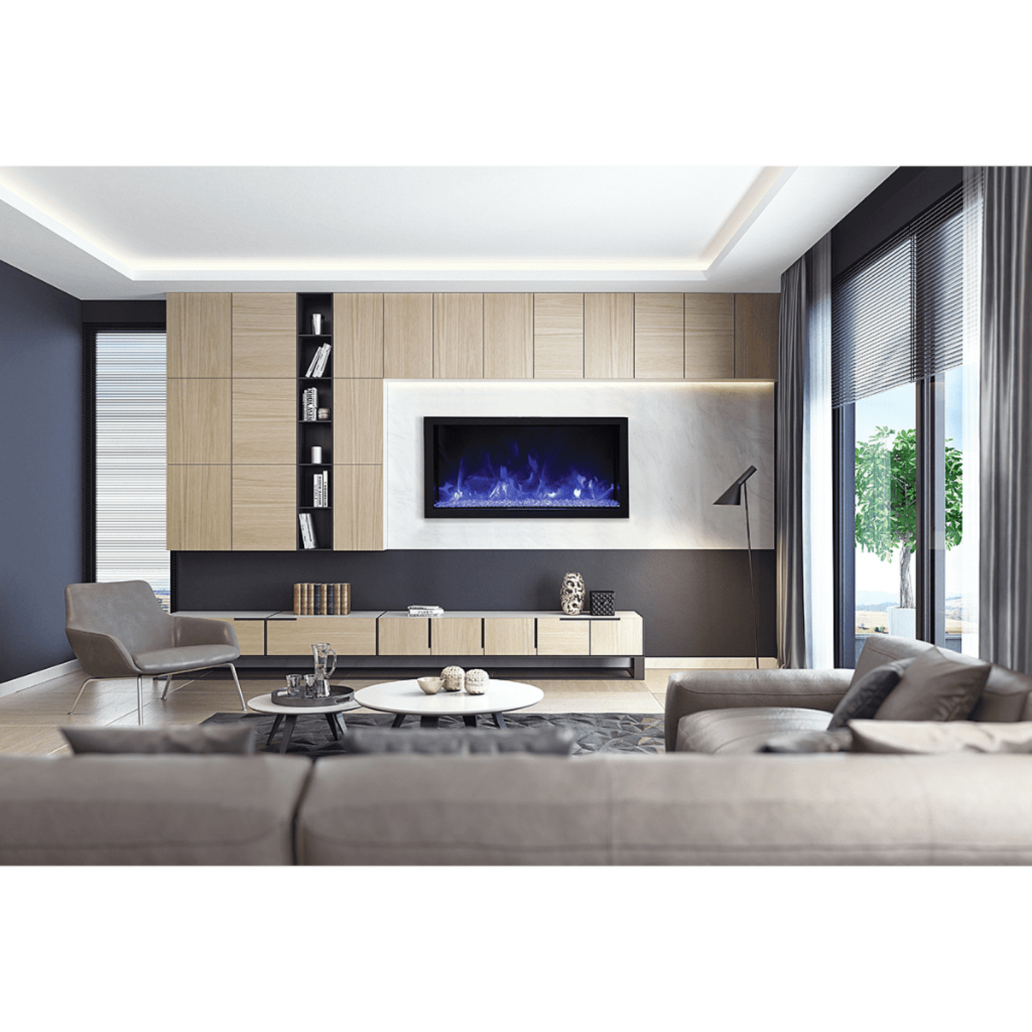 The Remii BI-45-XT electric fireplace is built with Amantii’s FIRE & ICE® Flame presentation made of three color LED light strips allowing for multi-color flame options. With just a click of the included remote control, choose from blue, rose, violet, yellow or orange colored flames. Additional media options available for purchase.