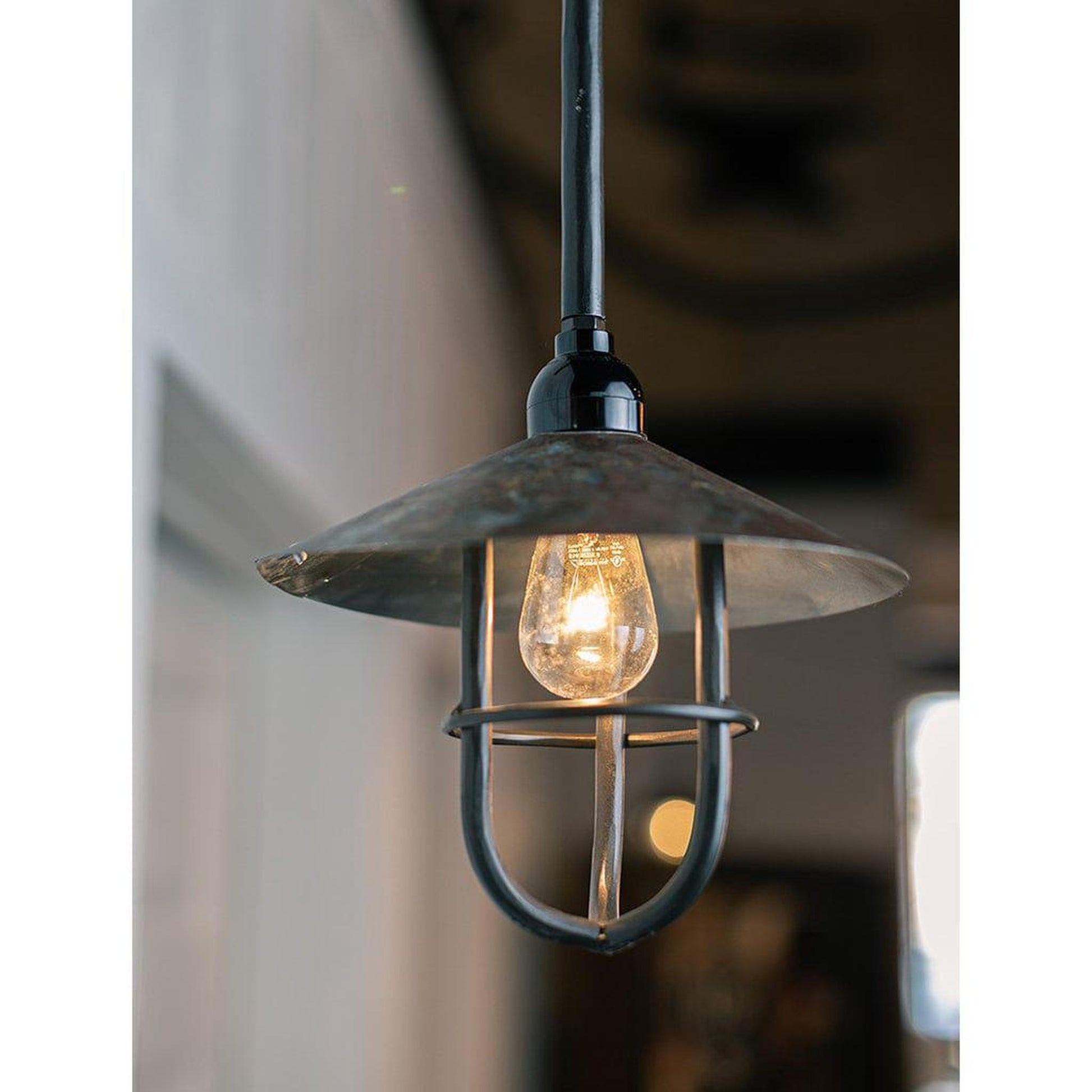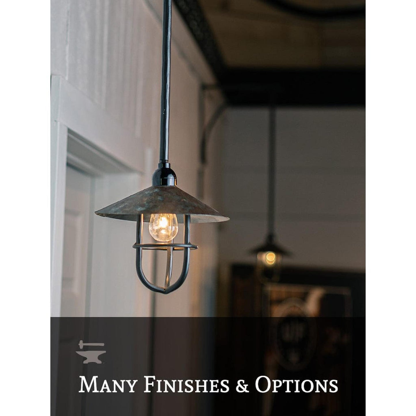 This pendant is not your average industrial fixture. The shade will be crafted from hand-fired copper or naturally weathered zinc for an incredibly unique, rich texture. The rod, cage and supporting elements are hand-forged and then riveted together in our mountain forge.