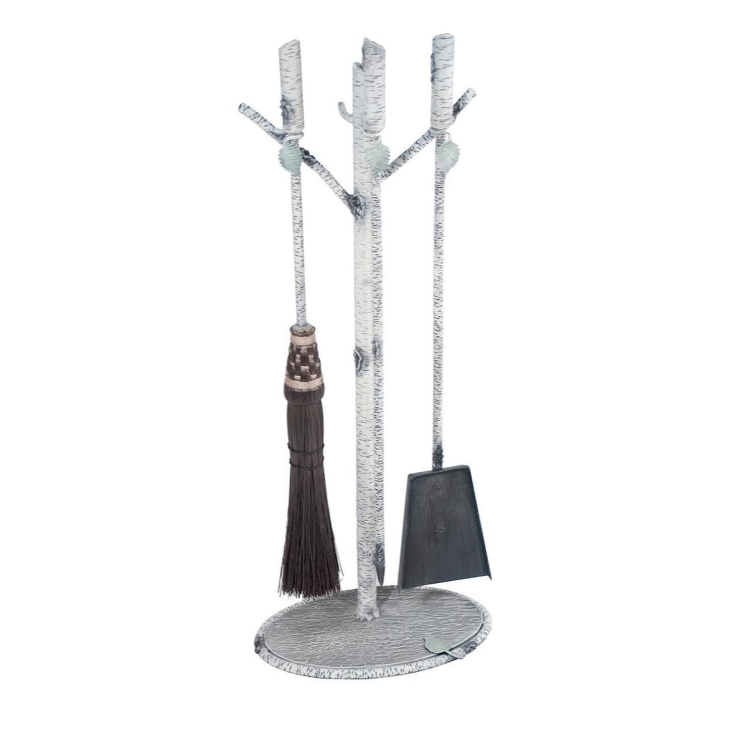 The Whisper Creek Fire Tool Set puts emphasis on a birch tree form, as well as texture. The main body and branches support the handmade tools, created here by our expert blacksmiths, and the broom is crafted by local artisans.