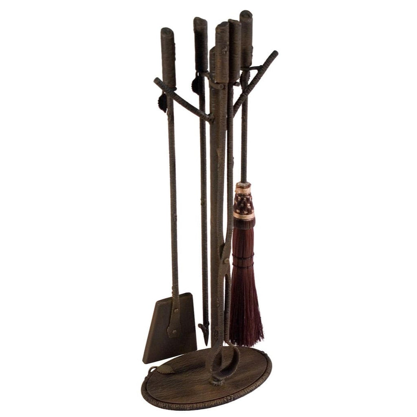 The set comes with a stand and four tools including poker, shovel, hand-strawed broom and tongs.