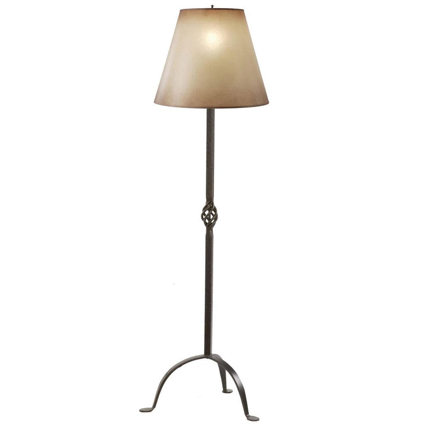 Basketweave has been a part of the traditional blacksmith's bag of tricks for two centuries. It is such an intriguing design. The tapered tri-leg design terminates in a classic penny foot that really sets this lamp apart. Shown here with an Amber Glow shade, there are several other options available for this wonderful rustic iron floor lamp.