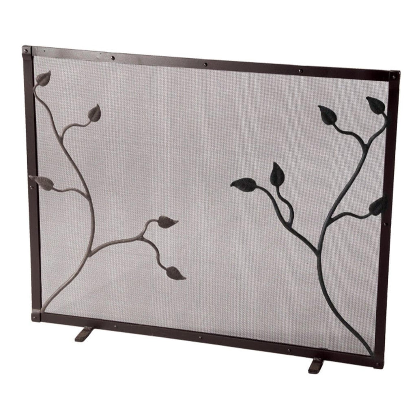 The Eden Isle Fire Screen features a single center iron panel with hand-forged iron vines and leaves. Attached to the base of this wrought iron fire screen are two fixed feet for additional balance and support. This flat-panel fireplace screen is shown in a natural black finish but is attractive in any of our premium finishes or added accents.