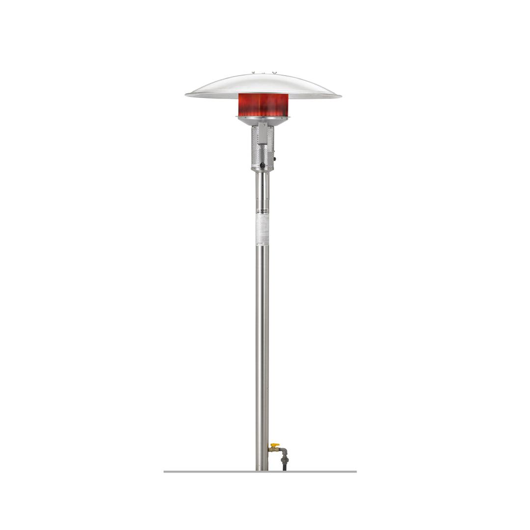 This heater offers a large deep aluminum disk reflector for maximum comfort, a primary aerated burner for minimal noise, and 100% safety shutoff. The post is available in a glossy black powder-coat finish or 304 stainless steel.