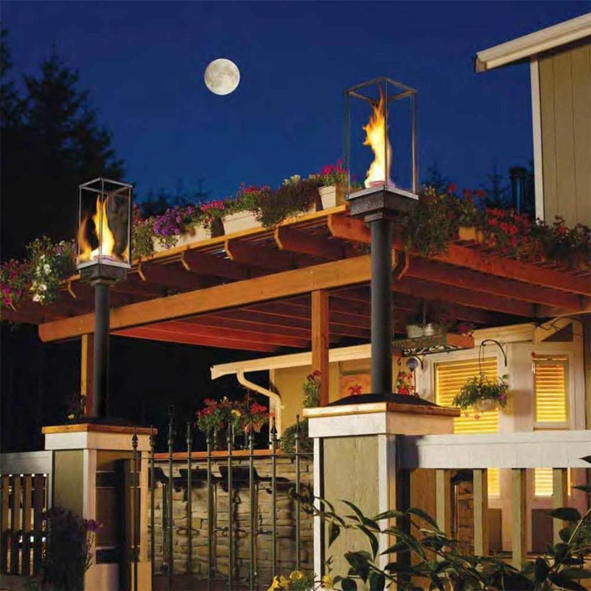Tempest Torch Created as a decorative outdoor furnishing for a wide array of exterior settings and applications, the Tempest Torch is designed to create the ultimate in lighting enhancement. The display possibilities are nearly endless; outdoor living spaces, retail or business store fronts, walkway pillars, pool areas, mounted onto movable bases or featured on an exterior wall or entry.
