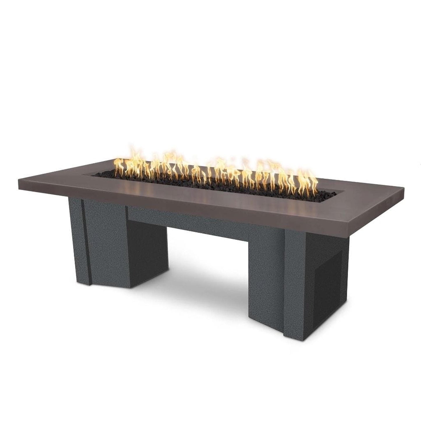 Alameda Rectangular Gas Fire Pit Table features a steel base and concrete tabletop with a woodgrain texture, adding a rustic charm to any space. Built with two access doors for LP tanks, one at each end, you can have enough fuel for hours of outdoor entertainment. Choose between Ash, Natural Gray, Gray, Chestnut, White Limestone, Black, Chocolate, Brown & Vanilla for its premium GFRC Smooth finish to make the perfect fire pit table for your yard.