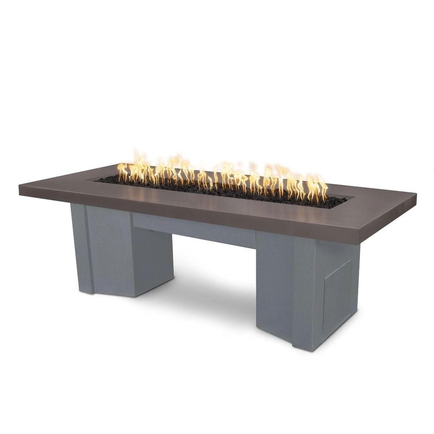 Alameda Rectangular Gas Fire Pit Table features a steel base and concrete tabletop with a woodgrain texture, adding a rustic charm to any space. Choose between Ash, Natural Gray, Gray, Chestnut, White Limestone, Black, Chocolate, Brown & Vanilla for its premium GFRC Smooth finish to make the perfect fire pit table for your yard.