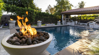 The Round Luna GFRC Concrete Fire Bowl comes with different ignition options: Match Lit or Electronic Ignition. LC Certified Match Light Ignition System that provides a simple manual ignition process that connects to your existing gas source and valve. And 12V Electronic ignition system that will relight your fire pit if the wind blows it out. The electronic ignition can be wired by your local electrician to be controlled by a light switch, pool controller (with available relay), or home automation system.